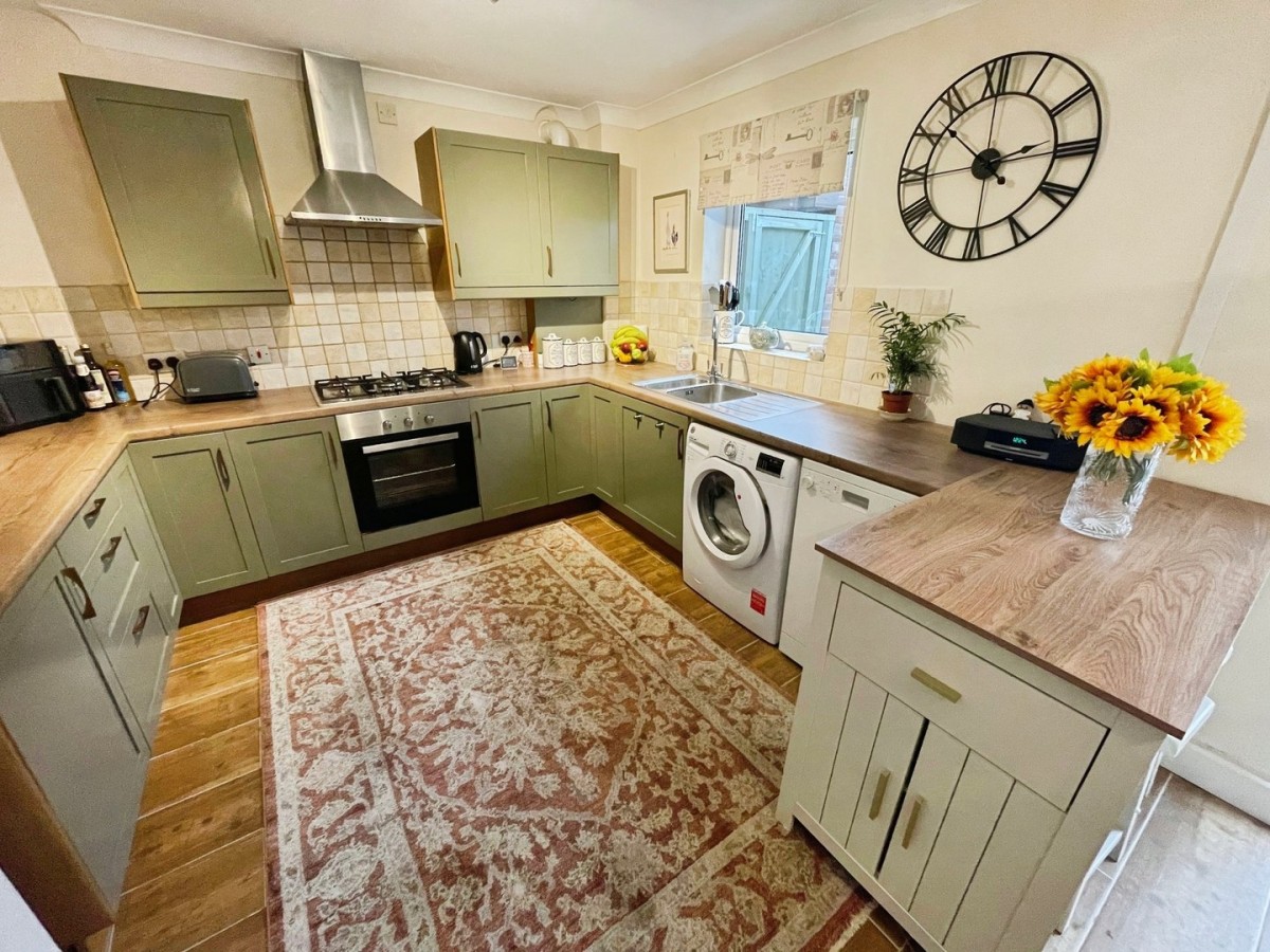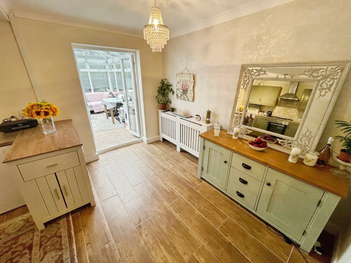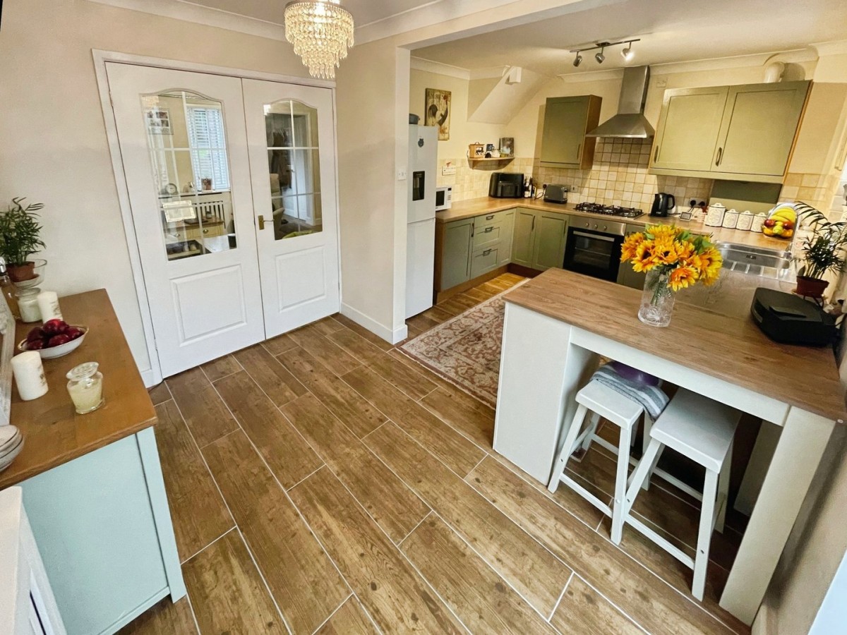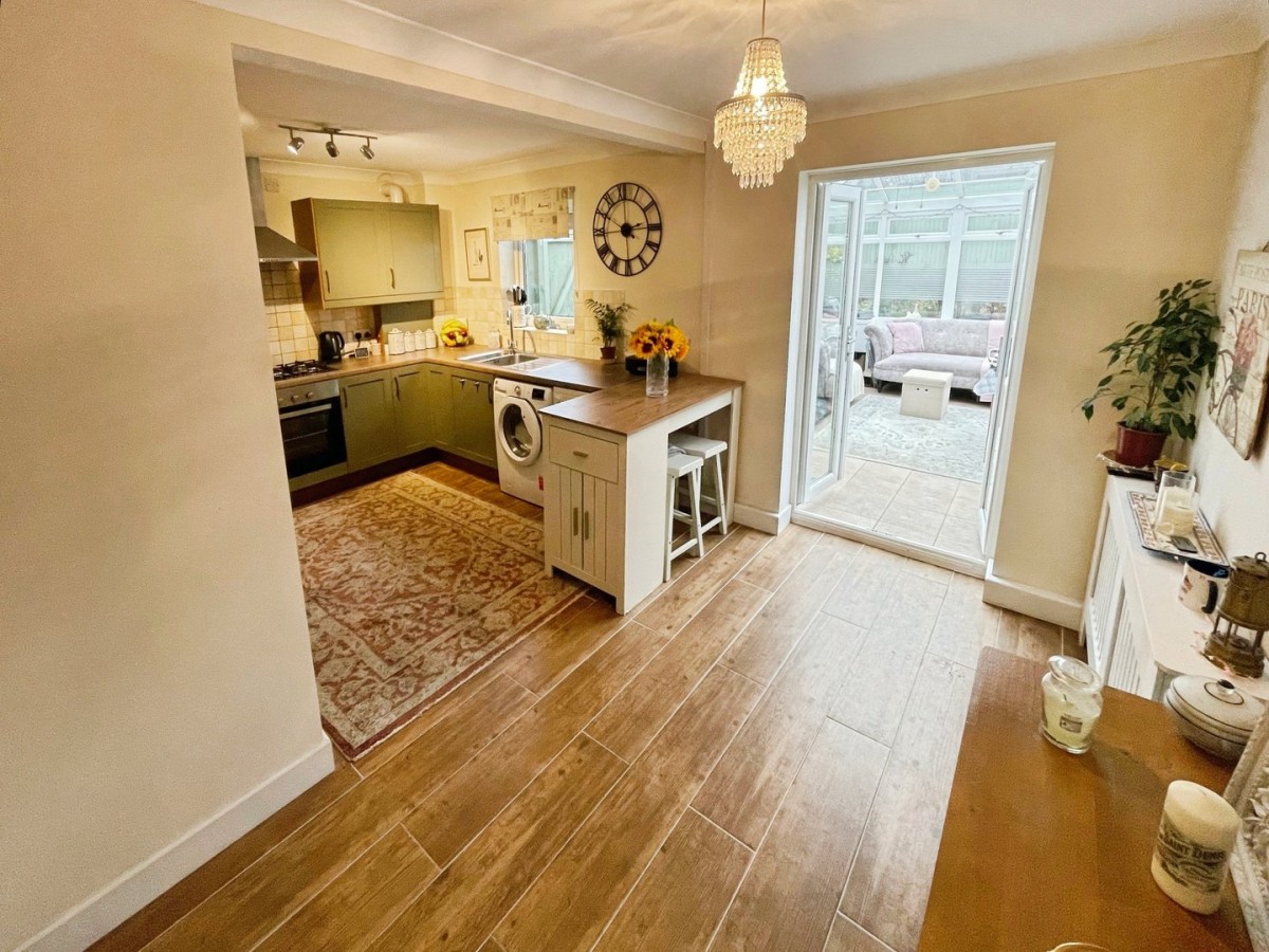 3.27m x 5.10m (10' 9" x 16' 9") Plastered, emulsioned and coved ceiling with pendant light over the dining area and centre spot lights to the kitchen. Plastered and emulsioned walls with tiling to the splash back areas, radiator, skirting and a continuation of the tiled flooring. A range of base and wall units in shaker style green with complementary roll top laminate worktops. Space for freestanding washing machine, dishwasher and fridge/freezer. Integrated electric oven and five ring gas hob with overhead chrome extractor fan. Inset one and half stainless steel sink with chrome mixer tap and cupboard housing a gas combination boiler. Ample space for family dining table and chairs. PVCu double glazed window overlooking the rear and PVCu double glazed French doors leading to the conservatory.