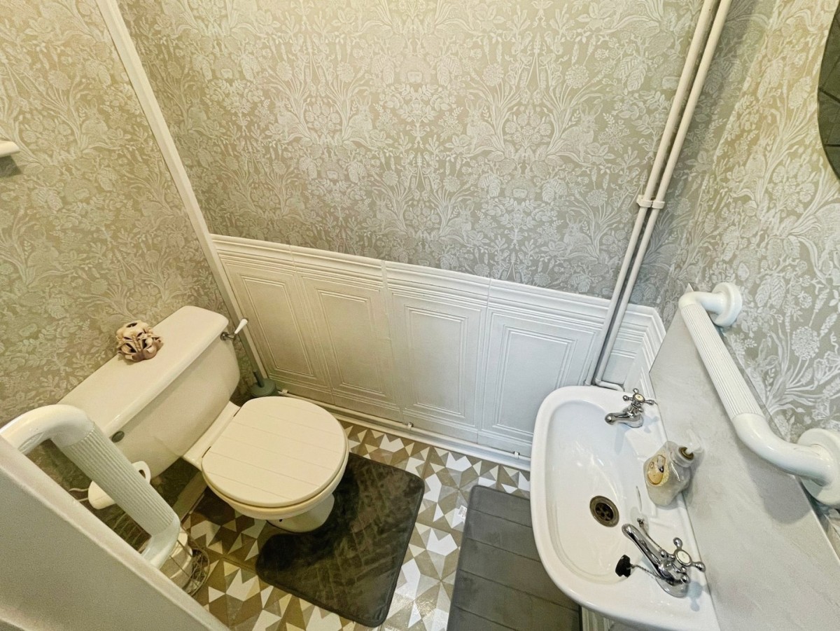0.86m x 1.52m (2' 10" x 5' 0") Textured ceiling with centre light, part papered / part panelled walls, vinyl flooring in tile effect and frosted PVCu double glazed window overlooking the front of the property. Two piece suite comprising low level w.c. wall mounted ceramic sink with chrome taps and tiling to the splash back areas. Wall mounted electric consumer box.