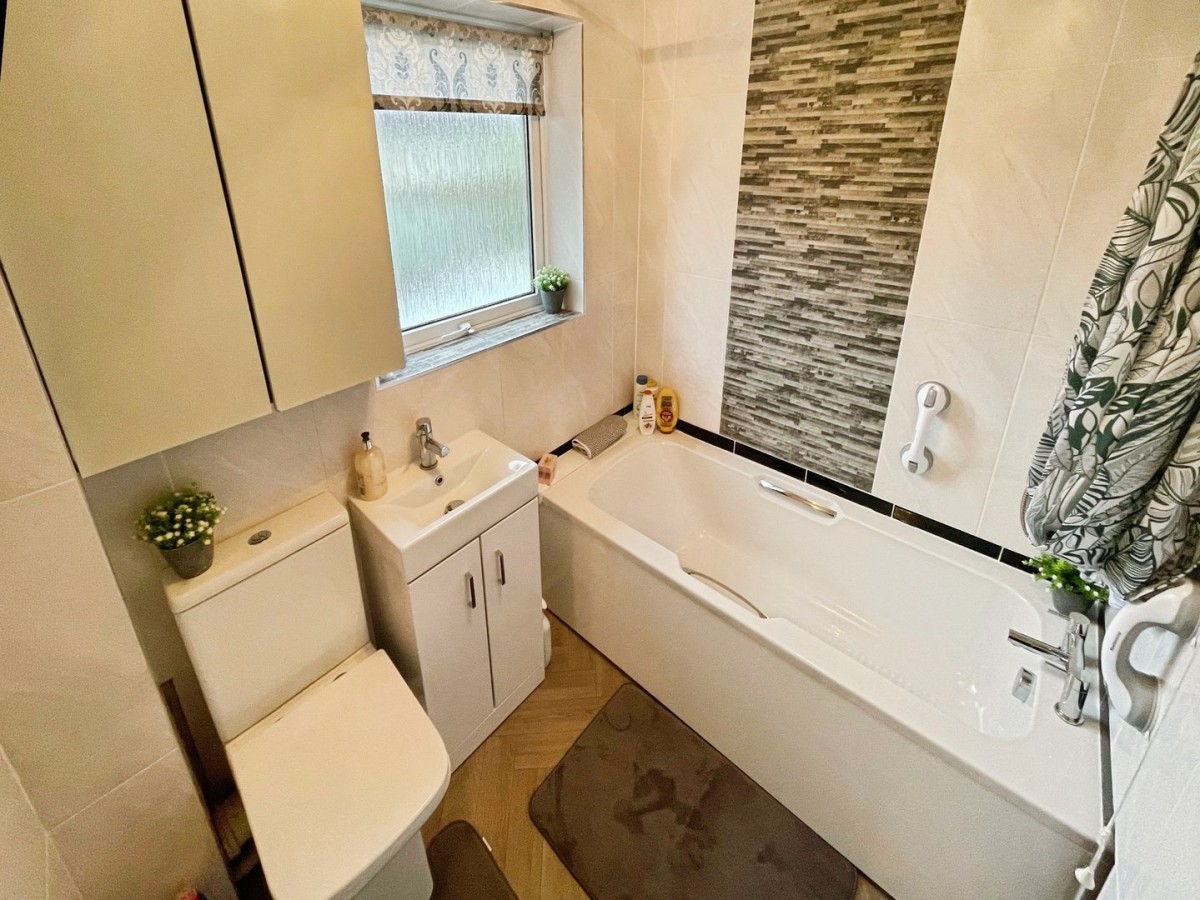 1.66m x 2.00m (5' 5" x 6' 7") Textured ceiling with centre light, fully tiled walls and vinyl flooring in Herringbone wood effect. Three piece suite comprising bath with chrome mixer tap and overhead chrome mixer shower, vanity sink with ceramic bowl and chrome mixer tap and WC. Wall mounted cabinet, mirror and chrome towel rail radiator. Frosted PVCu double glazed window overlooking the rear of the property.