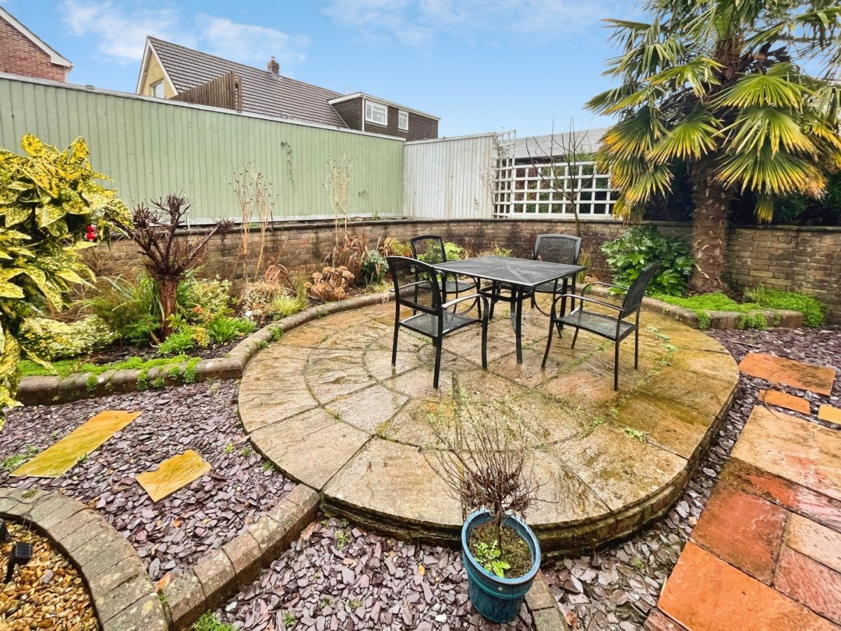 The rear garden is laid to patio with raised border, mature shrubs and palm tree. Tiered area with bark, pergola and large space to the side with further paving and decorative stone.