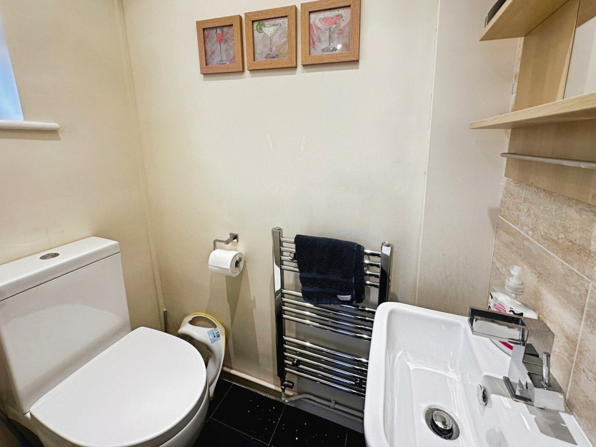 1.68m x 0.97m (5' 6" x 3' 2") PVCu frosted glazed window to the front. Recessed spotlights. Wall mounted electricity consumer unit. Wall mounted heated chrome towel rail. Two piece suite in white with a WC, wash hand basin with a chrome mixer tap. Wall mounted shelving and mirror. Quartz tiles to the floor.