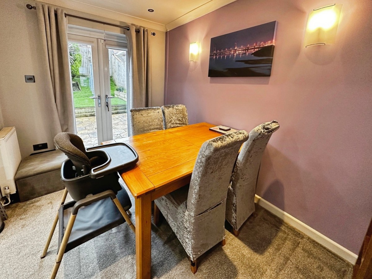 5.1m x 3.4m (16' 9" x 11' 2") Dining space overlooking the rear garden via PVCu double glazed French doors with perfect fit day/night roller blinds. Recess LED spotlights and fitted carpet.