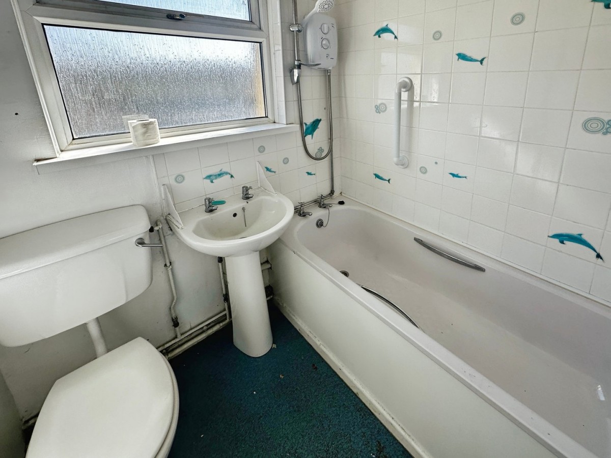 PVCu frosted glazed window to the rear. Central light fitting. Three piece suite in white with WC, wash hand basin and bath with over bath electric shower.