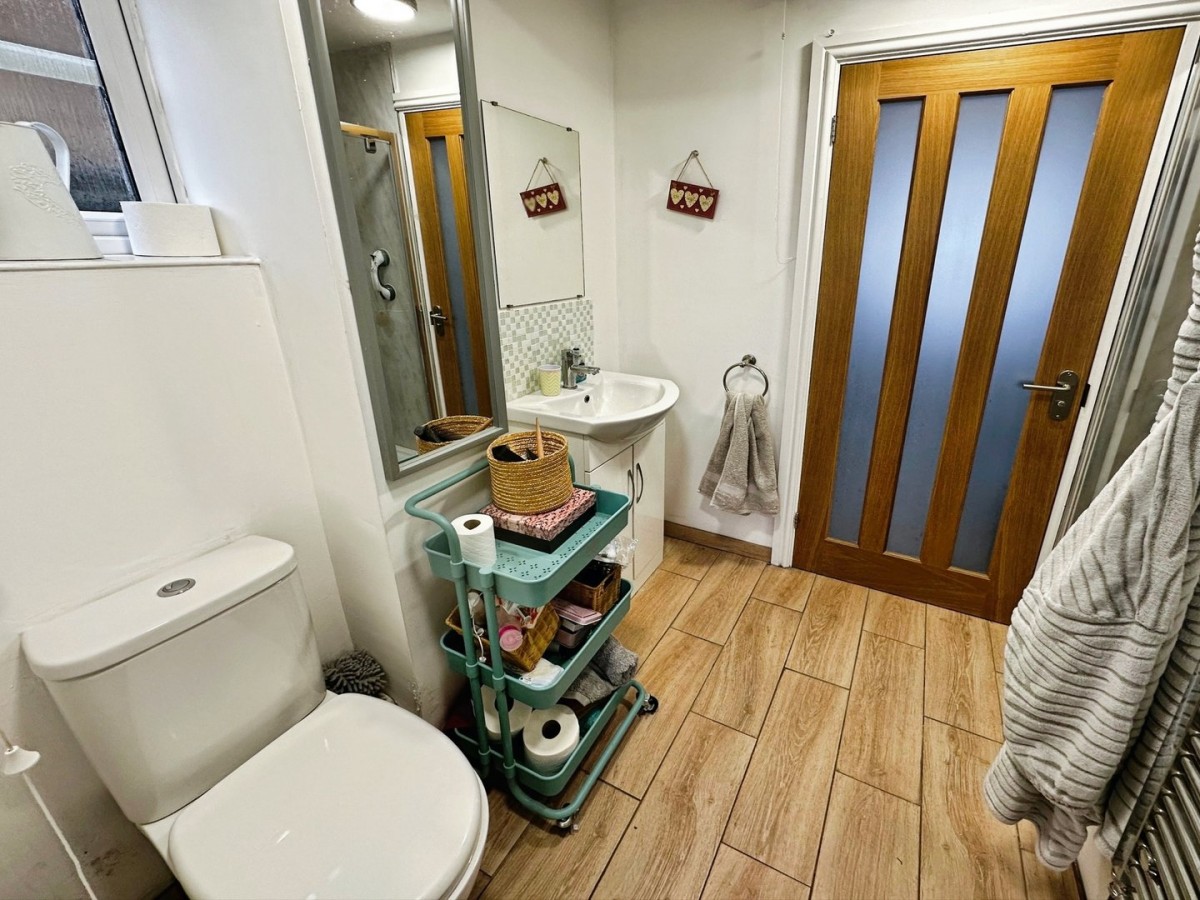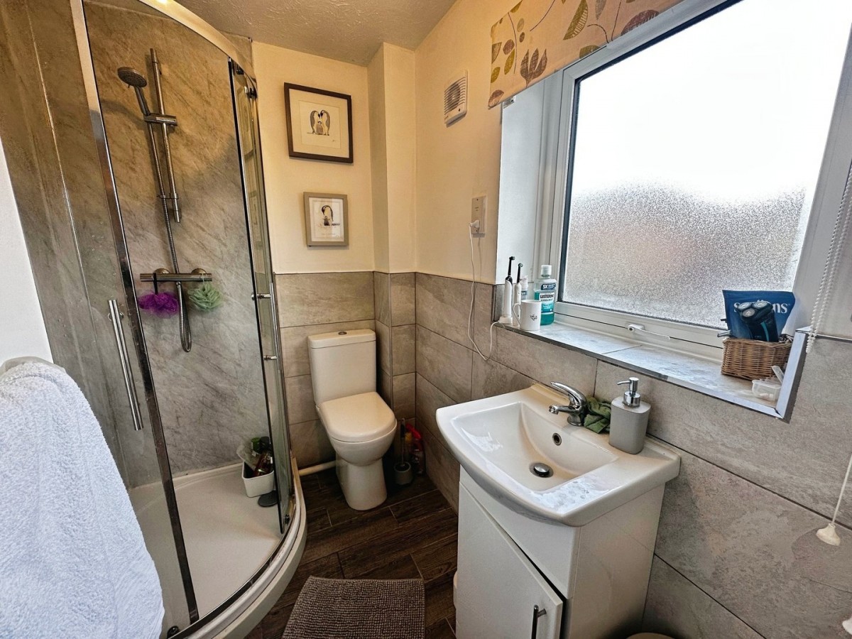 Ensuite shower room overlooking the front via PVCu frosted glazed window with a fitted roller blind finished with emulsioned walls, skirting and a ceramic tiled floor. Three piece suite with WC, wash hand basin with chrome mixer tap and storage below and a quadrant style shower cubicle with fully glazed doors housing a plumbed shower. Wall mounted heated chrome towel rail.