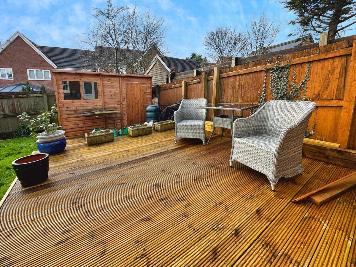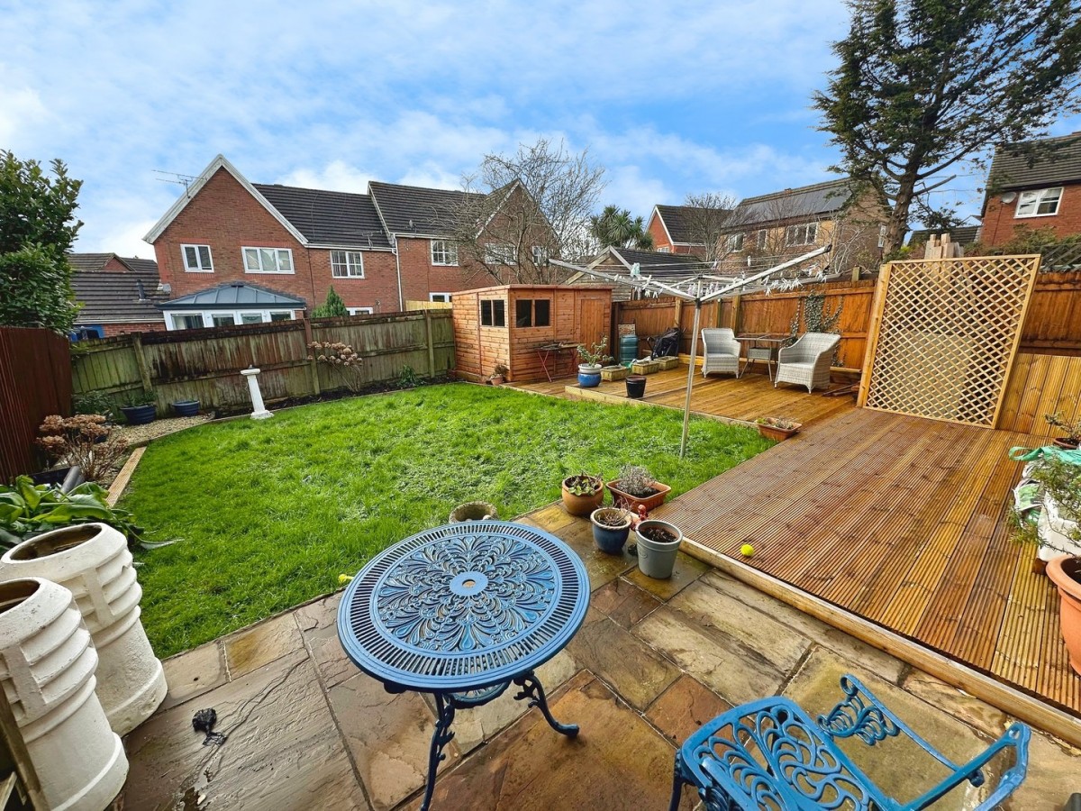 Enclosed South West facing rear garden laid to Indian sandstone patio, decking and lawn with perimeter bedding areas. Rear storage shed and side access back to the front of the property.