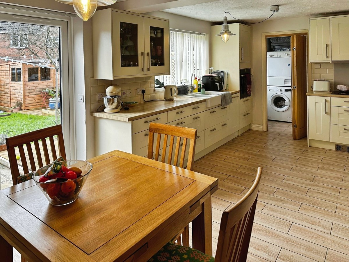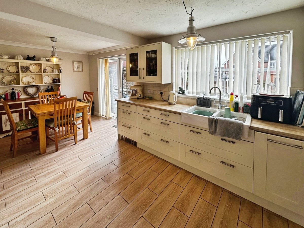 Dining space - central light pendant, coved ceiling, emulsioned walls, skirting and a ceramic tiled floor through into the kitchen which has a central light pendant, emusioned walls. Arrranged of low level and wall mounted units in a cream shaker style finish with brushed chrome handles and a complementary roll top worksurface with ceramic tiles to the splashback. Inset double Belfast sink with swan neck tap. Integrated induction hob with overhead extractor hood and glass splashback. Integrated waist height oven, fridge/freezer and slimline dishwasher. Pull out full height larder cupboard and a concertina oak internal door leading through into;