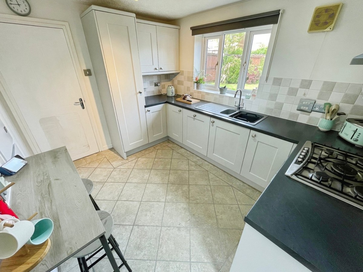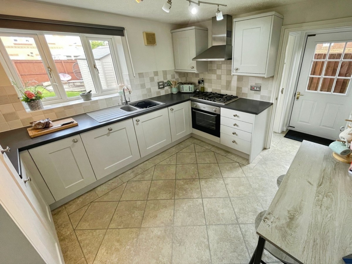 2.71m x 3.34m (8' 11" x 10' 11") Textured ceiling with centre spot lights, plastered and emulsioned walls with tiling to the splash back areas, skirting and fitted vinyl tiled flooring. A range of base and wall units in shaker style grey with complementary roll top laminate work surfaces. Integrated dish washer, pull out large larder cupboard, inset one and half resin sink with chrome mixer tap, integrated electric oven with five ring gas hob and overhead chrome extractor fan. Wall mounted extractor fan, alcove housing a freestanding fridge/freezer, PVCu double glazed window overlooking the rear of the property, part glazed wood door leading to the utility and door to the downstairs w.c.