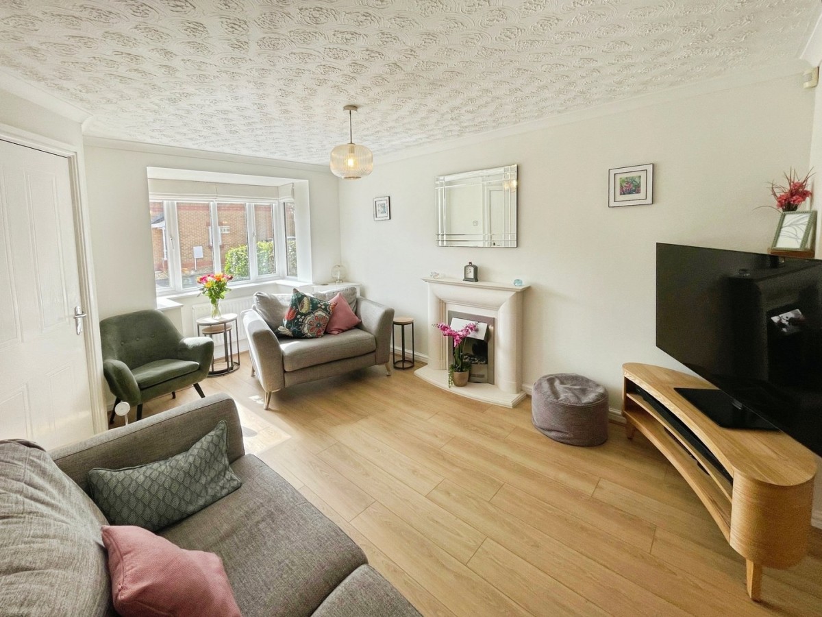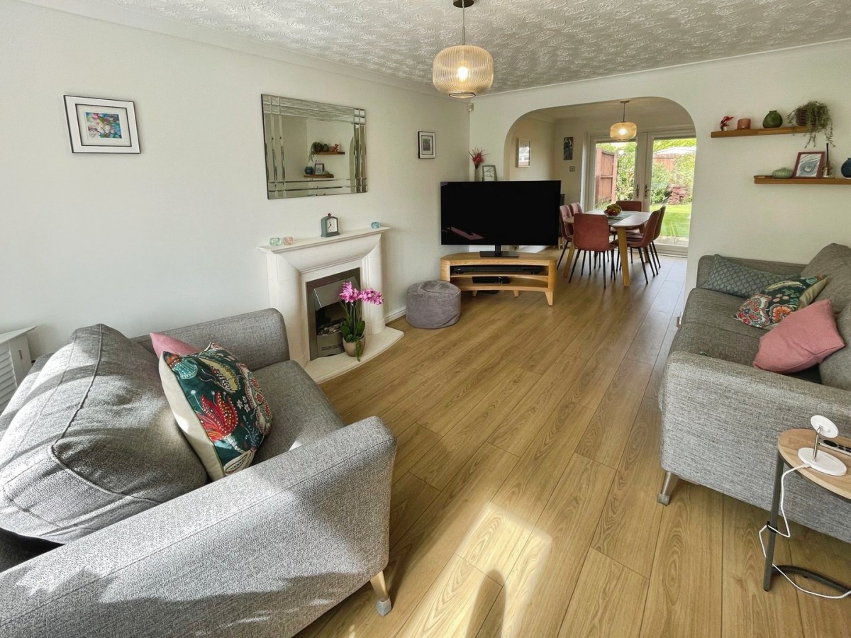3.26m max x 4.89m max(10' 8" x 16' 1") Textured and coved ceiling with centre pendant, plastered and emulsioned walls, skirting and a continuation of the laminate flooring in wood effect. Feature fireplace with stone mantle and hearth housing an electric fire. PVCu double glazed box bay window overlooking the front of the property and radiator. Built in under stairs storage cupboard and arch opening into the dining room.