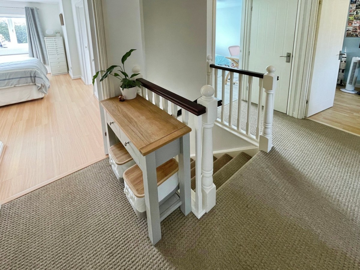 Carpeted stairs leading to the first floor with handrail. Textured ceiling with centre pendant light, smoke alarm, access to the loft via drop down ladder which is partially boarded with lighting. Plastered and emulsioned walls, skirting and a continuation of the fitted carpet. Doors leading to four bedrooms, family bathroom and airing cupboard housing the hot water tank and shelving.