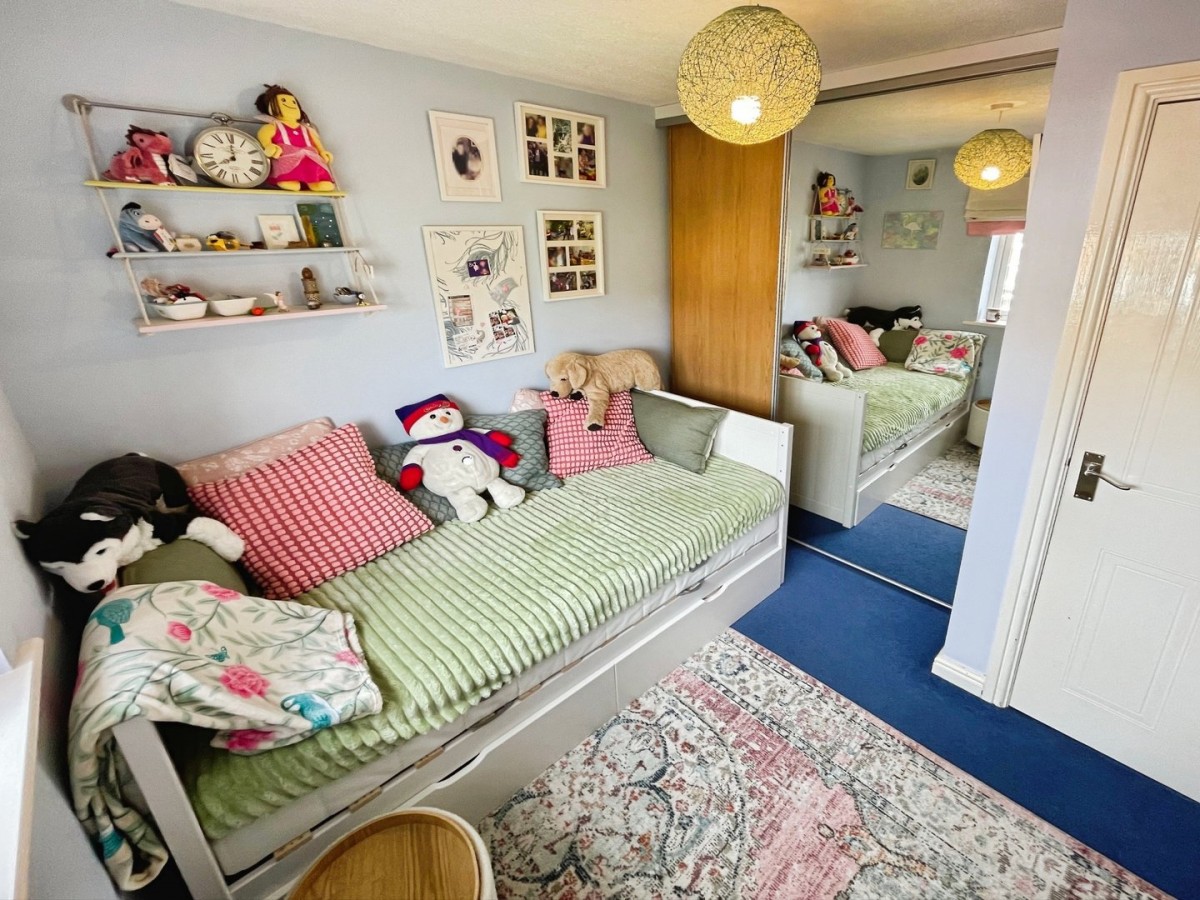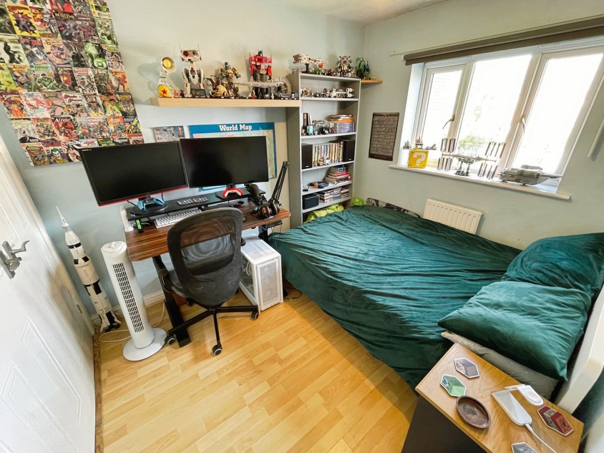2.35m x 2.93m (7' 9" x 9' 7") Textured ceiling with centre pendant light, plastered and emulsioned ceiling with centre pendant light, plastered and emulsioned walls, skirting and laminate flooring in wood effect. Built in double storage cupboard with hanging rails and shelving. PVCu double glazed window overlooking the rear of the property and radiator.