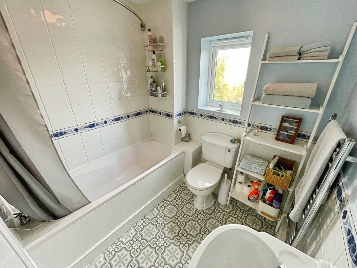 1.96m max x 2.06m max(6' 5" x 6' 9") Textured ceiling with centre light and extractor fan, half tiled /half emulsioned walls with full height tiles to the wall in white gloss with centre strip around the bath area, vinyl flooring in tile effect. Three piece suite comprising bath with chrome mixer taps, overhead electric shower and shower curtain, low level w.c. and pedestal sink with chrome mixer taps. Chrome wall mounted radiator, frosted PVCu double glazed window overlooking the rear of the property and extractor fan.