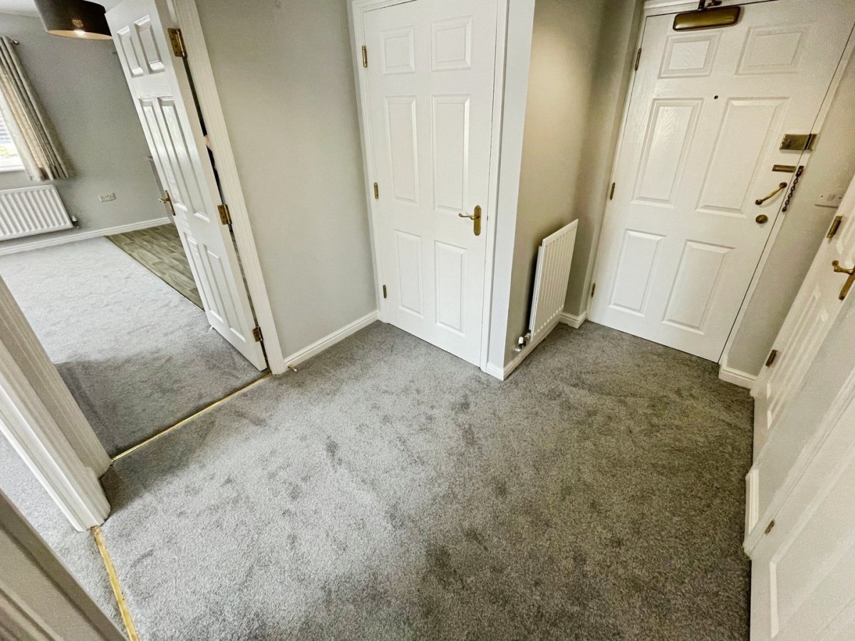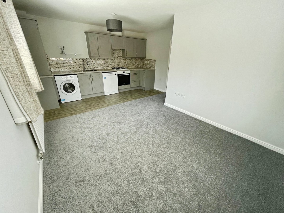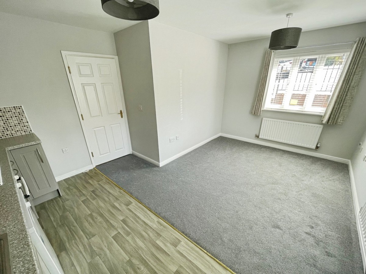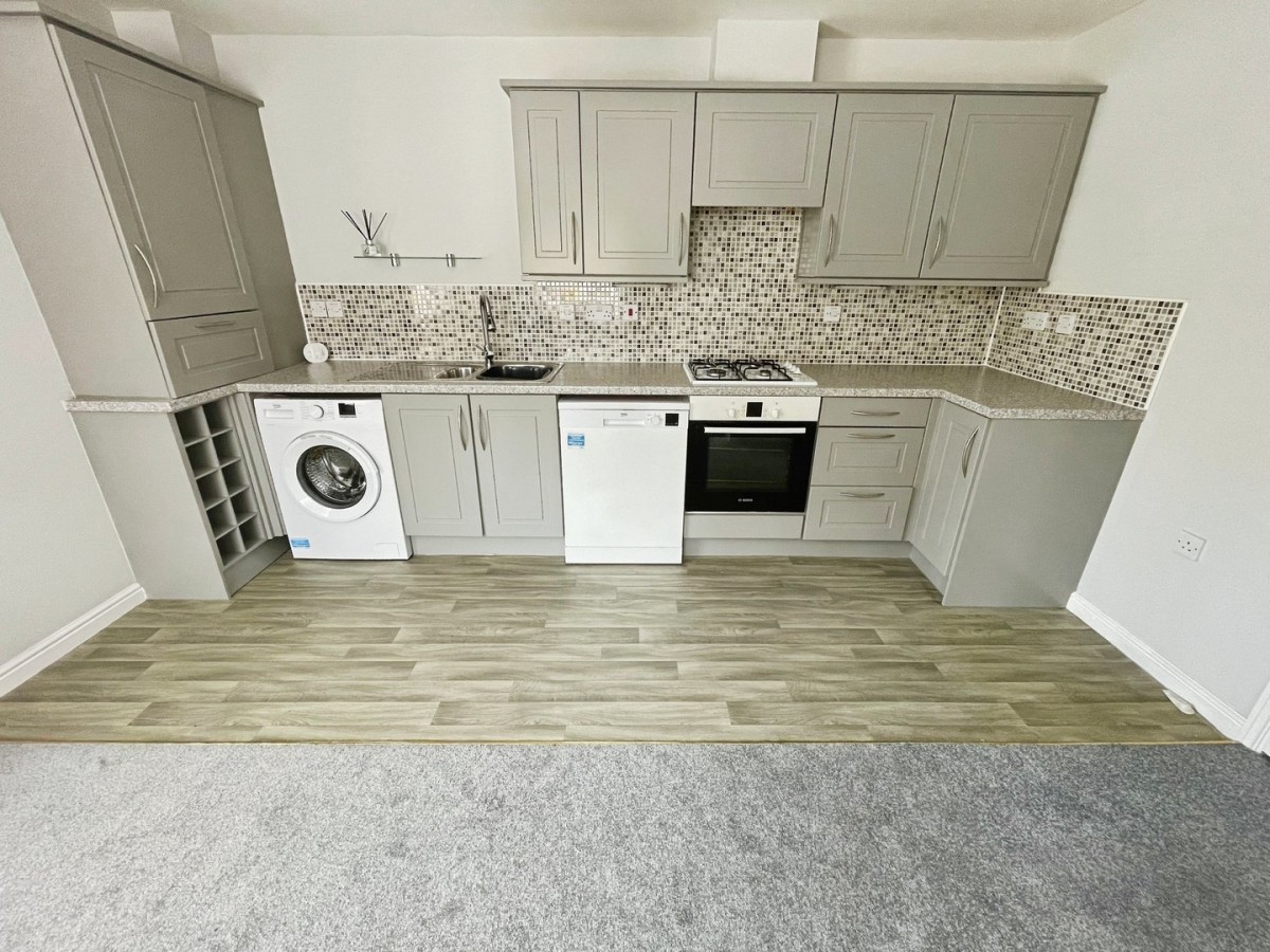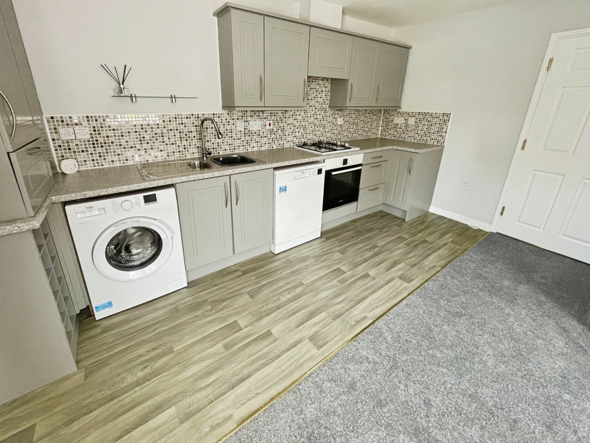 5.32m x 4.20m (17' 5" x 13' 9") Emulsioned ceiling, two pendant lights, emulsioned walls with tiling to splash back areas in the kitchen, two radiators, PVCu double glazed window overlooking the side and one PVCu window overlooking the front of the property, skirting, wood effect vinyl flooring to the kitchen and fitted carpet to the lounge area. A range of wall and base units in a shaker style grey with complementary roll top work surface. Inset one and a half stainless steel sink with chrome mixer tap. Space for washing machine and dishwasher which can remain with the property. Built in electric oven with four ring gas hob and overhead extractor fan. Cupboard housing gas combination boiler. Space for freestanding fridge/freezer.