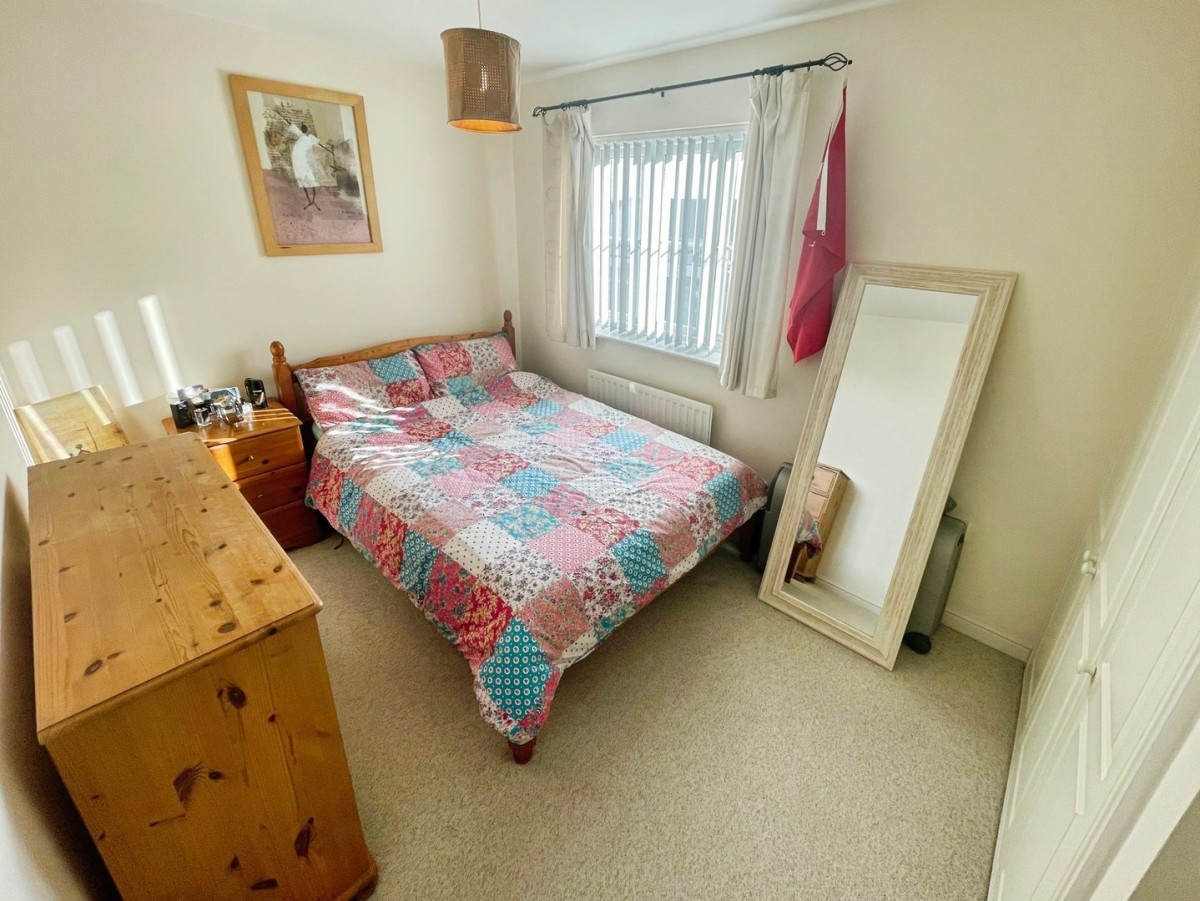 Via painted wooden door. Plastered and emulsioned ceiling with two pendant lights, plastered and emulsioned walls, skirting, radiator and fitted carpet. PVCu double glazed window overlooking the rear of the property. Two built in storage cupboards with hanging rails, shelving and housing the electric consumer box. Doors leading to the bathroom and lounge/kitchen.