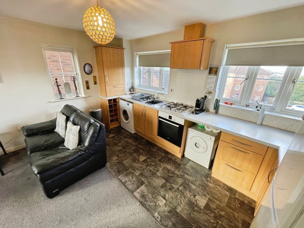 Plastered and emulsioned ceiling with two pendant lights, plastered and emulsioned walls, skirting, two radiators, fitted vinyl in the kitchen area and fitted carpet in the lounge area. A range of base and wall units in shaker style with complementary roll top laminate worktops housing an inset one and a half stainless steel sink with chrome mixer tap. Four ring gas hob with overhead extractor fan, integrated electric oven and cupboard housing the gas combination boiler. Space for freestanding washing machine, tumble dryer and fridge/freezer. Four PVCu double glazed windows one overlooking the front, two overlooking the rear and one overlooking the side of the property.