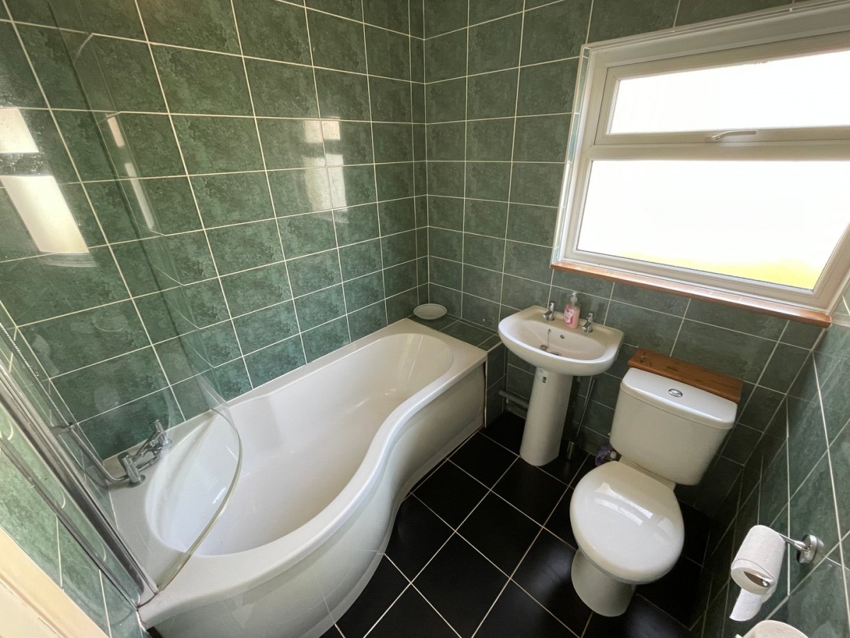 Textured ceiling with centre light, floor to ceiling tiled walls, tiled flooring, Three piece suite comprising p shaped bath with folding glass screen, chrome bath taps with wall mounted shower attachment, pedestal wash hand basin with chrome taps and low level w.c. Frosted PVCu double glazed window overlooking the rear of the property and radiator.