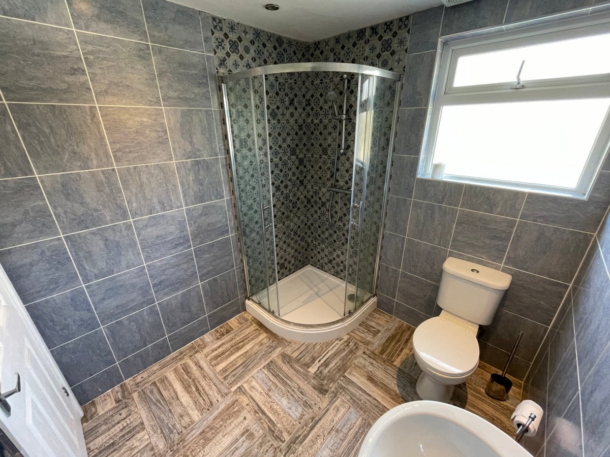 Skimmed and emulsioned ceiling with inset chrome spot lights, extractor fan, floor to ceiling tiled walls, tiled flooring, PVCu frosted double glazed window overlooking the rear of the property and chrome towel rail radiator. Three piece suite comprising pedestal wash hand basin with chrome mixer tap, low level w.c. curved corner shower with sliding glass screen and overhead chrome mixer shower.