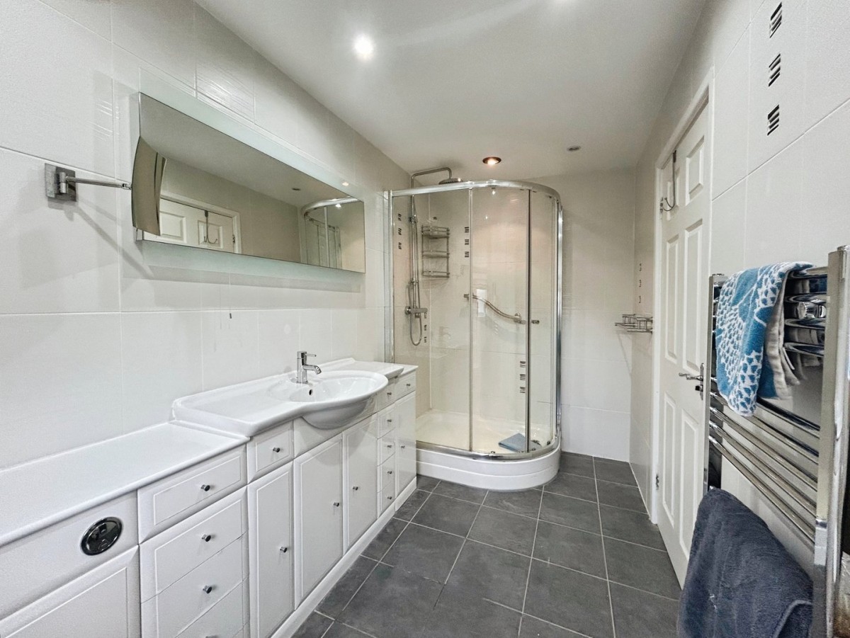 Skimmed and emulsioned ceiling with inset spot lights, fully tiled walls and slate effect tiled flooring. Built in vanity units with storage housing the w.c. and wash hand basin with chrome mixer tap and corner shower cubicle. PVCu frosted window to the side of the property and chrome towel rail.