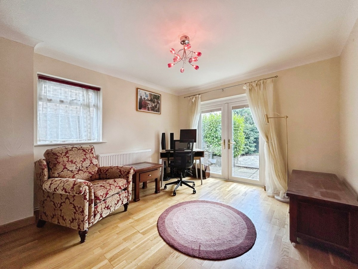 Emulsioned ceiling and walls, coving, centre light, PVCu window overlooking the side of the property and French doors leading out to the rear garden. Built in storage cupboard, skirting and a continuation of the oak wood flooring. Courtesy door to the double garage.
