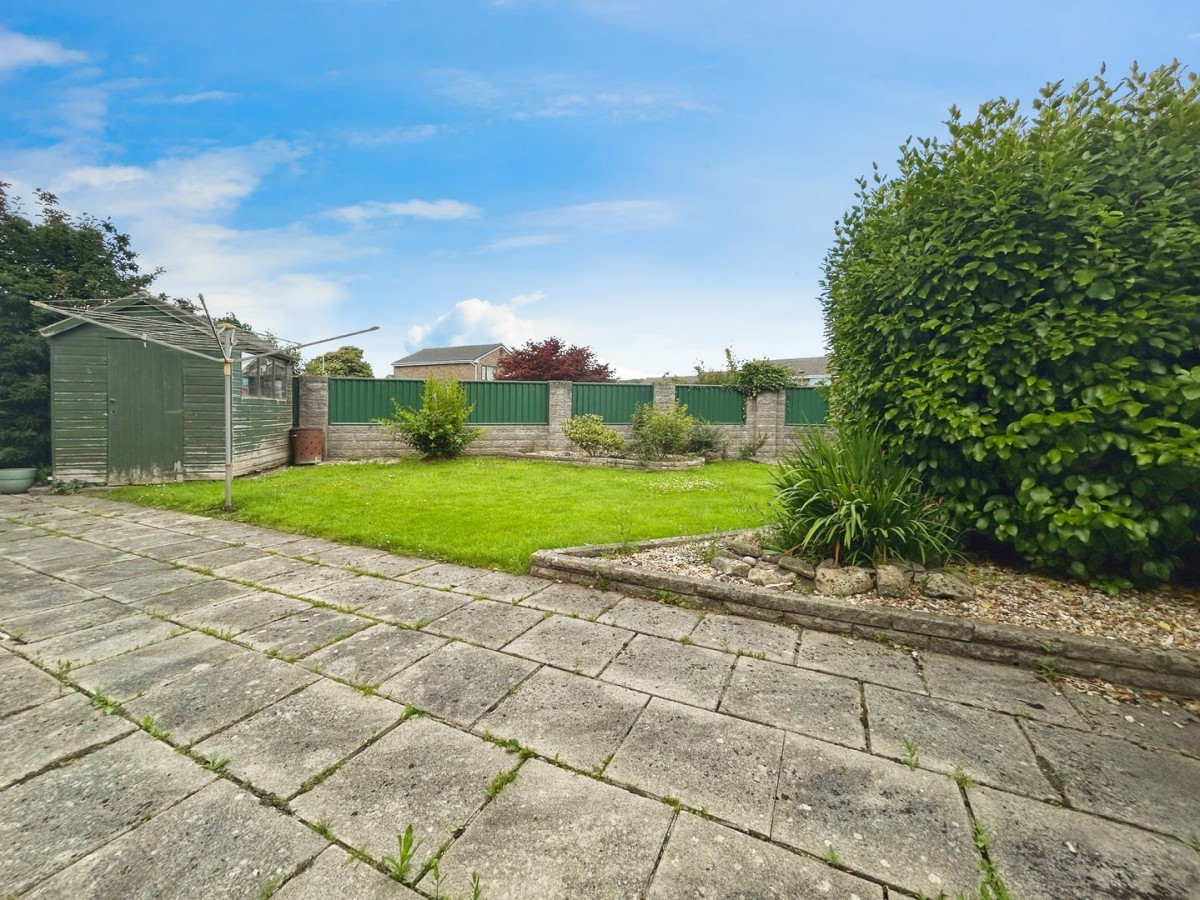Low maintenance rear garden bound by block wall with patio and lawned areas with two low level borders, chipping's and trees. Wooden shed to remain. Wrap around patio with pathway leading to a galvanised gate which leads to the front of the property.