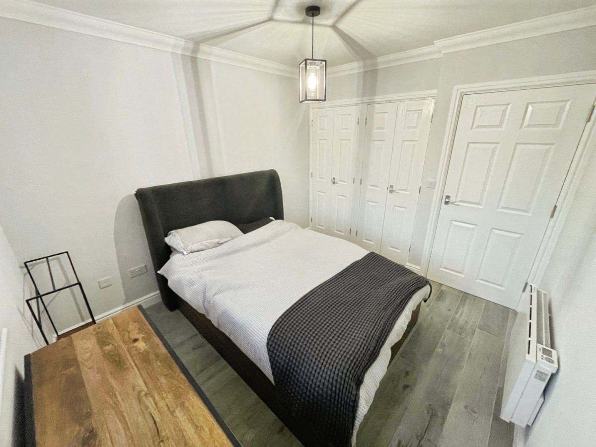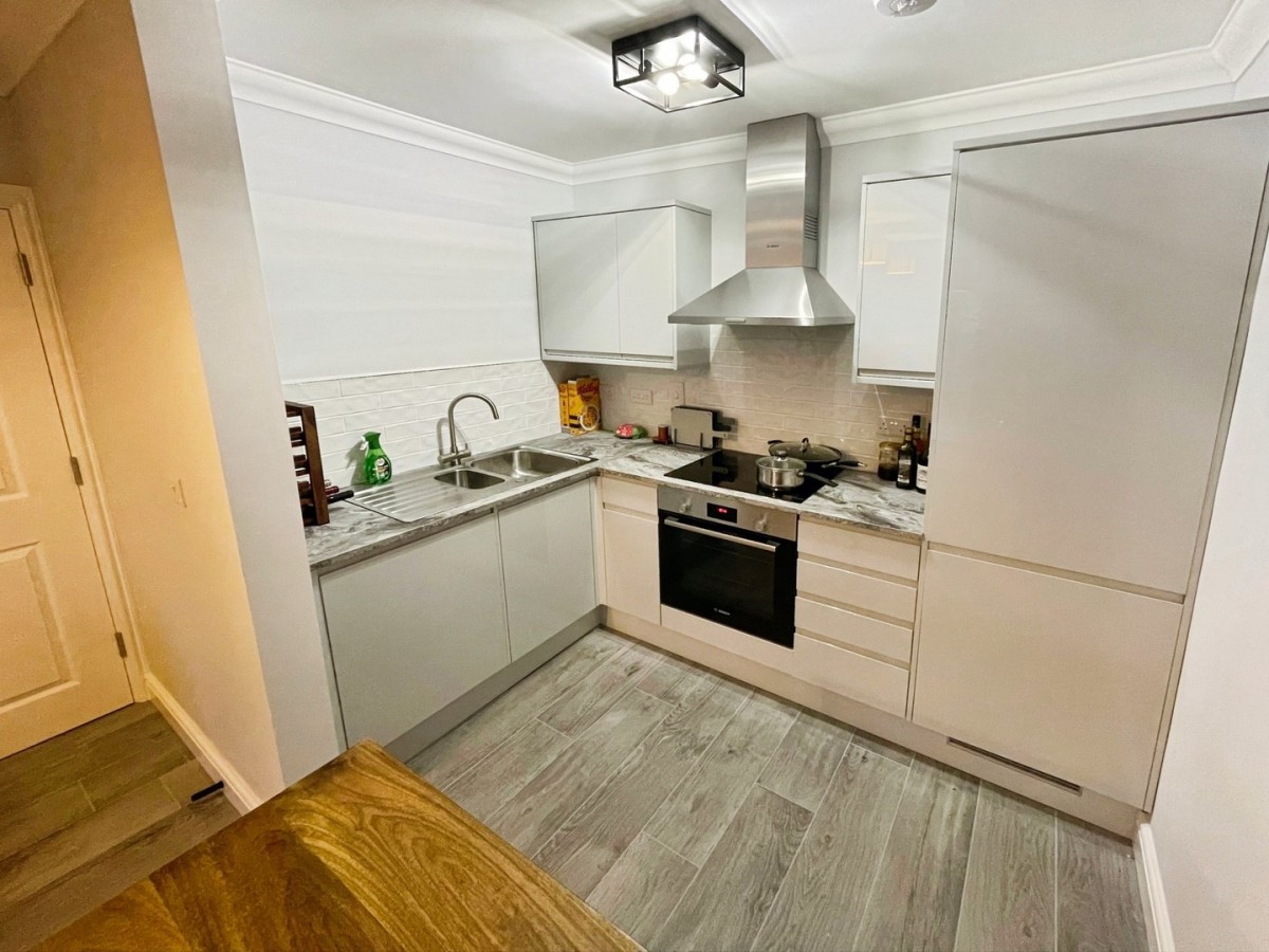1.79m x 2.56m (5' 10" x 8' 5") Emulsioned and coved ceiling, centre light, smoke alarm, emulsioned walls, grey subway tiling to splash back areas, skirting and a continuation of the tiled flooring. A newly installed kitchen comprising a range of wall and base units in a slab gloss grey effect with complementary square edge marble effect work surface. Inset one and a half stainless steel sink with chrome mixer tap. Integrated electric oven with four ring electric hob with overhead chrome extractor fan. Integrated fridge/freezer. Integrated Washing machine/dryer. Door to entrance hall.
