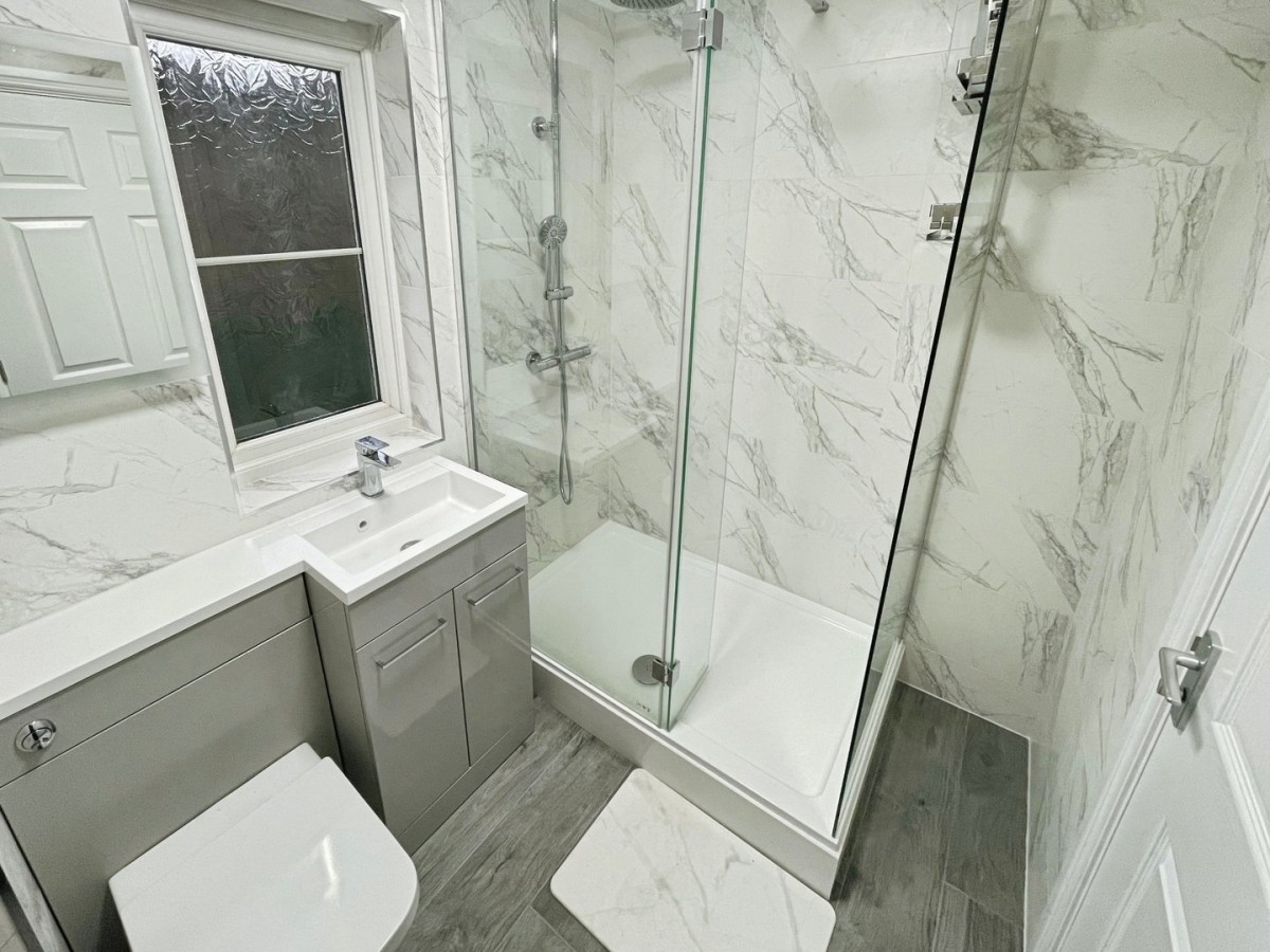 1.70m x 2.18m (5' 7" x 7' 2") Emulsioned and coved ceiling, centre light, grey marble effect tiled walls, wall mounted electric chrome radiator, frosted PVCu double glazed window overlooking the side of the property and tiled flooring. Three piece suite comprising low level WC vanity unit, vanity sink unit with chrome mixer tap, large walk in shower with overhead chrome mixer shower and hand held attachment.