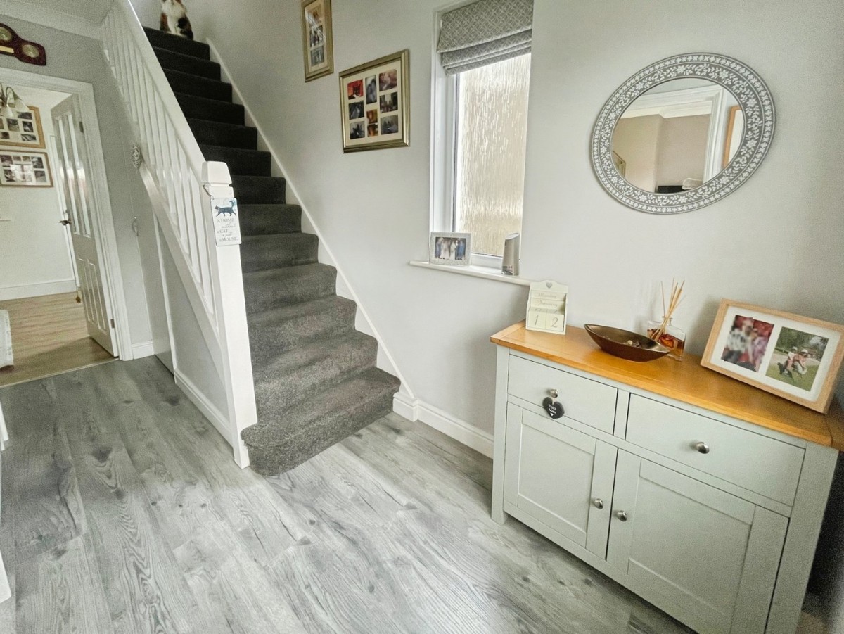 Textured and coved ceiling with light fitting to remain, emulsioned walls, laminate flooring, PVCu frosted glazed window to the side of the property with roman blind to remain and glazed doors leading into the lounge and second reception room. Under stairs storage, radiator and carpeted stairs with spindle balustrade leading to the first floor.