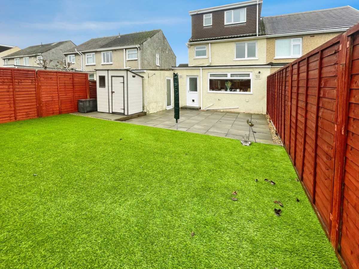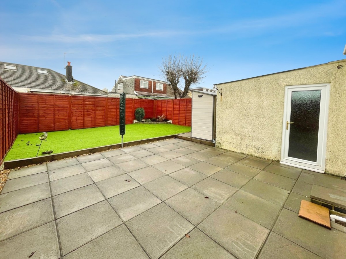 The rear garden is enclosed by fencing, paved patio, wooden sleeper edging with Astroturf and planting area. Plastic storage shed to remain and frosted PVCu door leading into the garage.