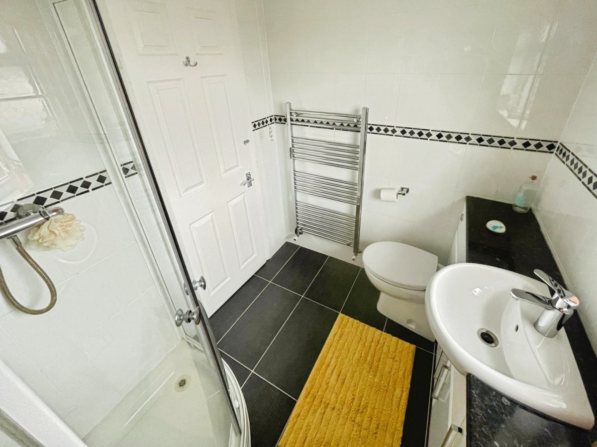 1.90m x 1.70m (6' 3" x 5' 7") Emulsioned ceiling, fully tiled walls, tiled flooring, PVCu frosted double glazed window to the rear with fitted blind and extractor. Three piece suite comprising quadrant shower with stainless steel shower head and attachment, vanity unit housing the porcelain wash hand basin with stainless steel mixer tap, w.c. and storage below and laminate work top. Stainless steel towel rail.