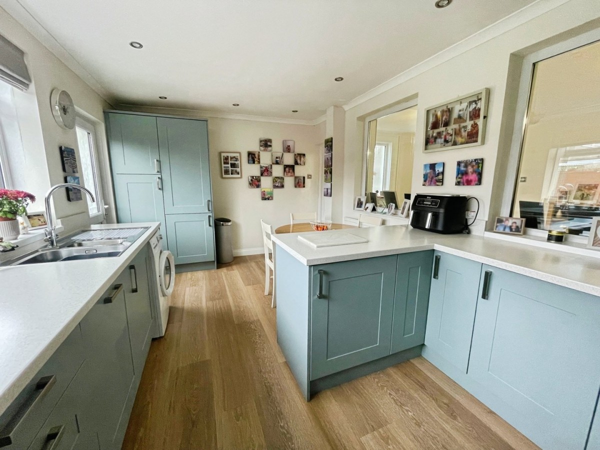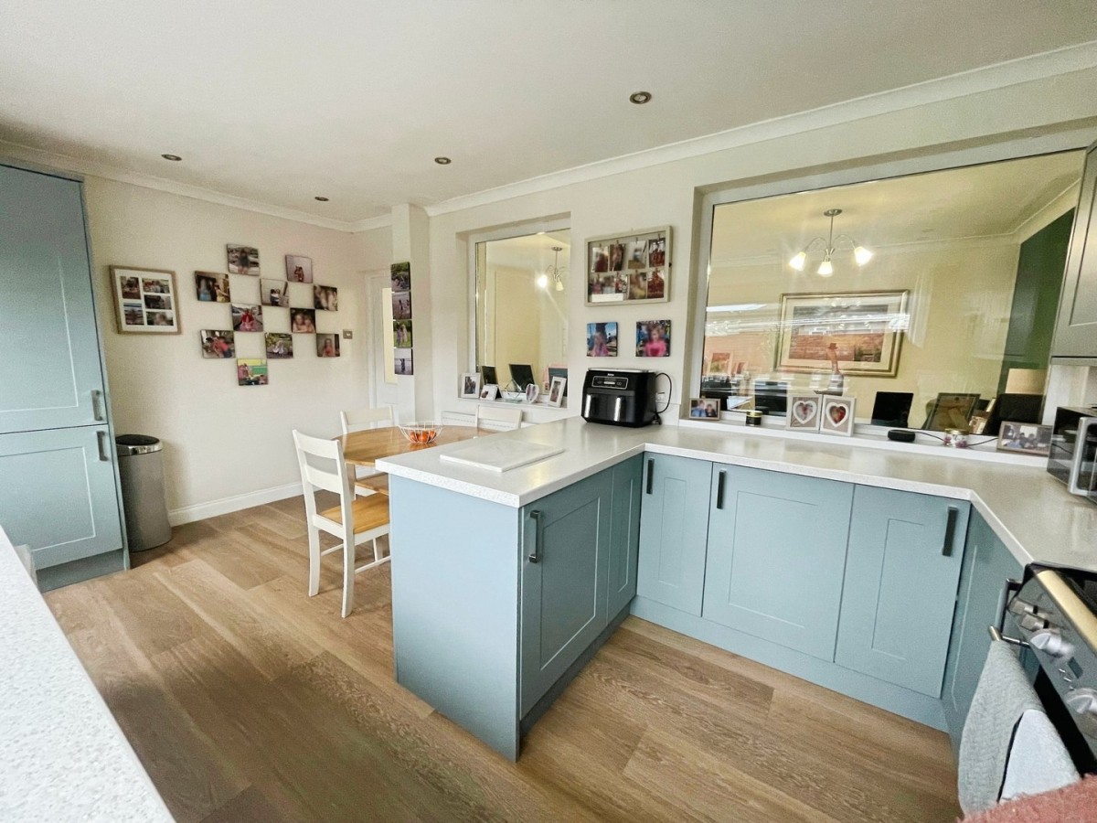 4.90m x 3.10m (16' 1" x 10' 2") Emulsioned and coved ceiling with spot lights, emulsioned walls, radiator and Kardean flooring. A range of wall and base units with complementary work surfaces with matching up stands and breakfast bar. Integrated dishwasher and fridge/freezer and separate pantry. Extractor fan and combination boiler housed within a kitchen cupboard. Space for oven and washing machine. Franke one and half stainless steel sink and drainer with stainless steel mixer tap. PVCu window overlooking the garden and PVCu frosted door leading out to the garden. Space for dining table and chairs.