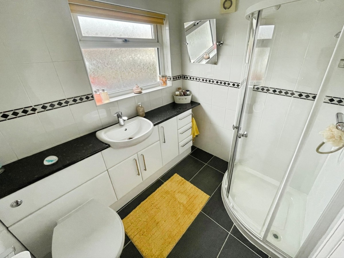 1.70m x 1.50m (5' 7" x 4' 11") Emulsioned ceiling, tiled walls, frosted PVCu double glazed window to the rear, radiator and tiled flooring. Three piece suite comprising shower cubicle with bi-fold door, extractor fan, electric shower with stainless steel shower head and shelving, low level w.c. and pedestal wash hand basin with stainless steel hot and cold taps.
