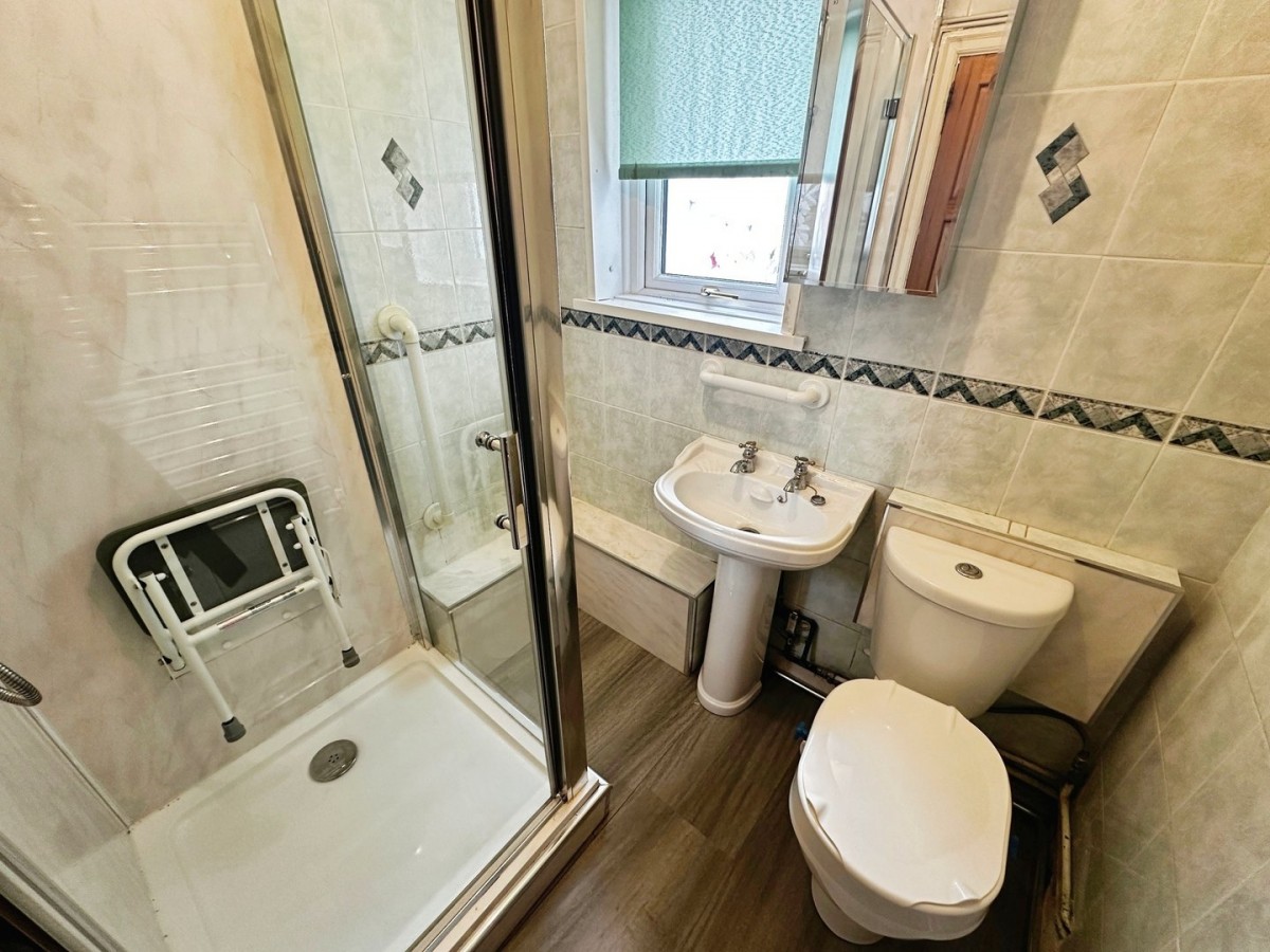 PVCu frosted glazed window with fitted roller blind to the side. Full height ceramic tiles to the wall and a vinyl floor. Three piece suite in white with a WC, wash hand basin and corner shower cubicle with Respertex to the splashback housing a plumbed shower with a pull down seat and fully glazed doors. Wall mounted heated chrome towel rail.