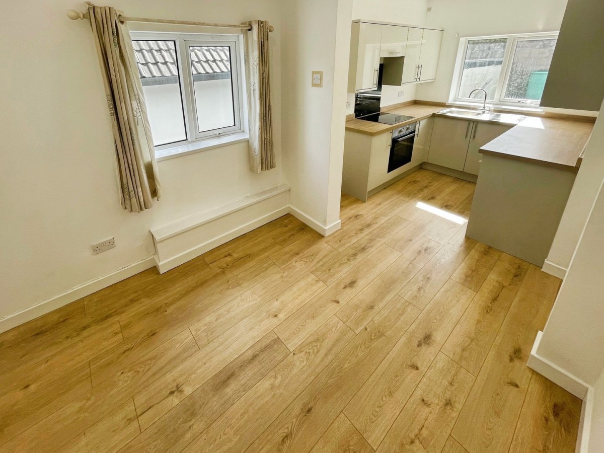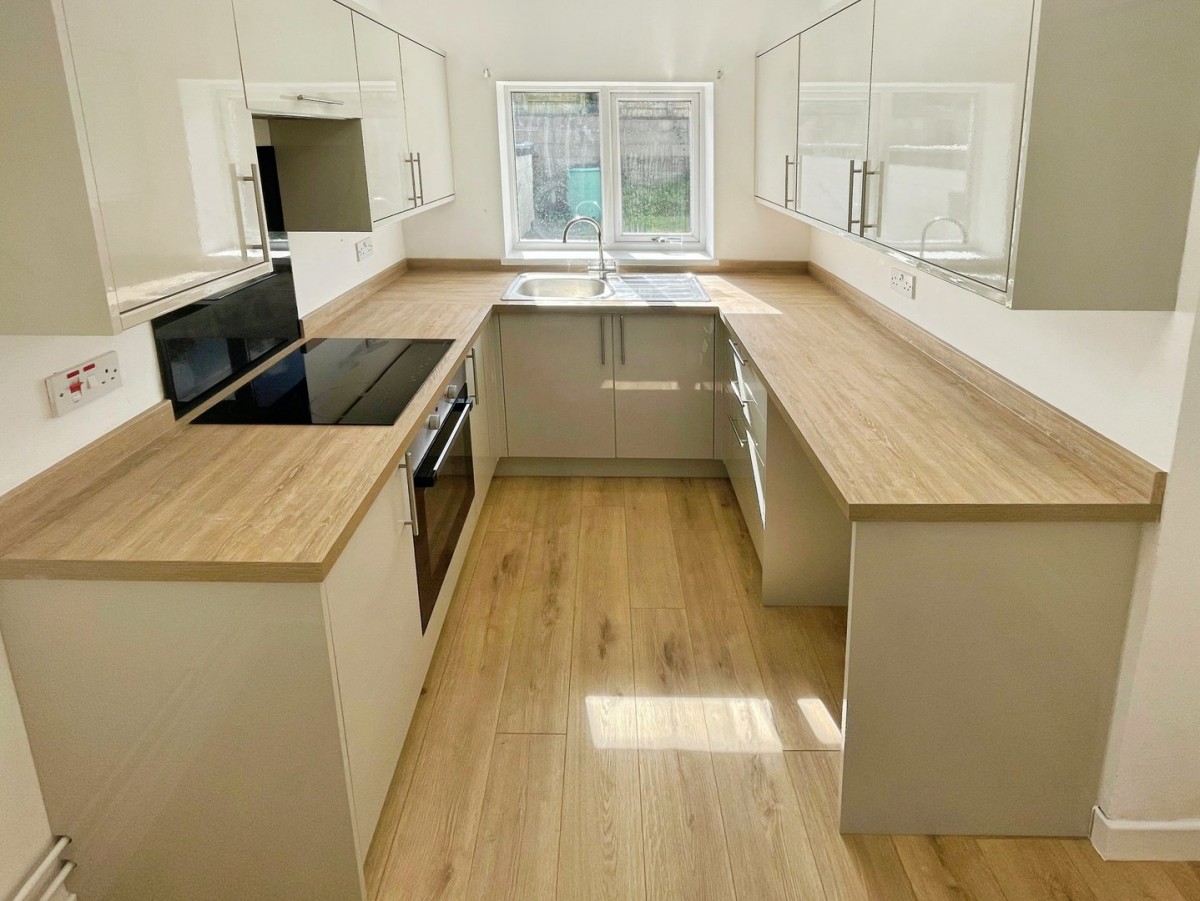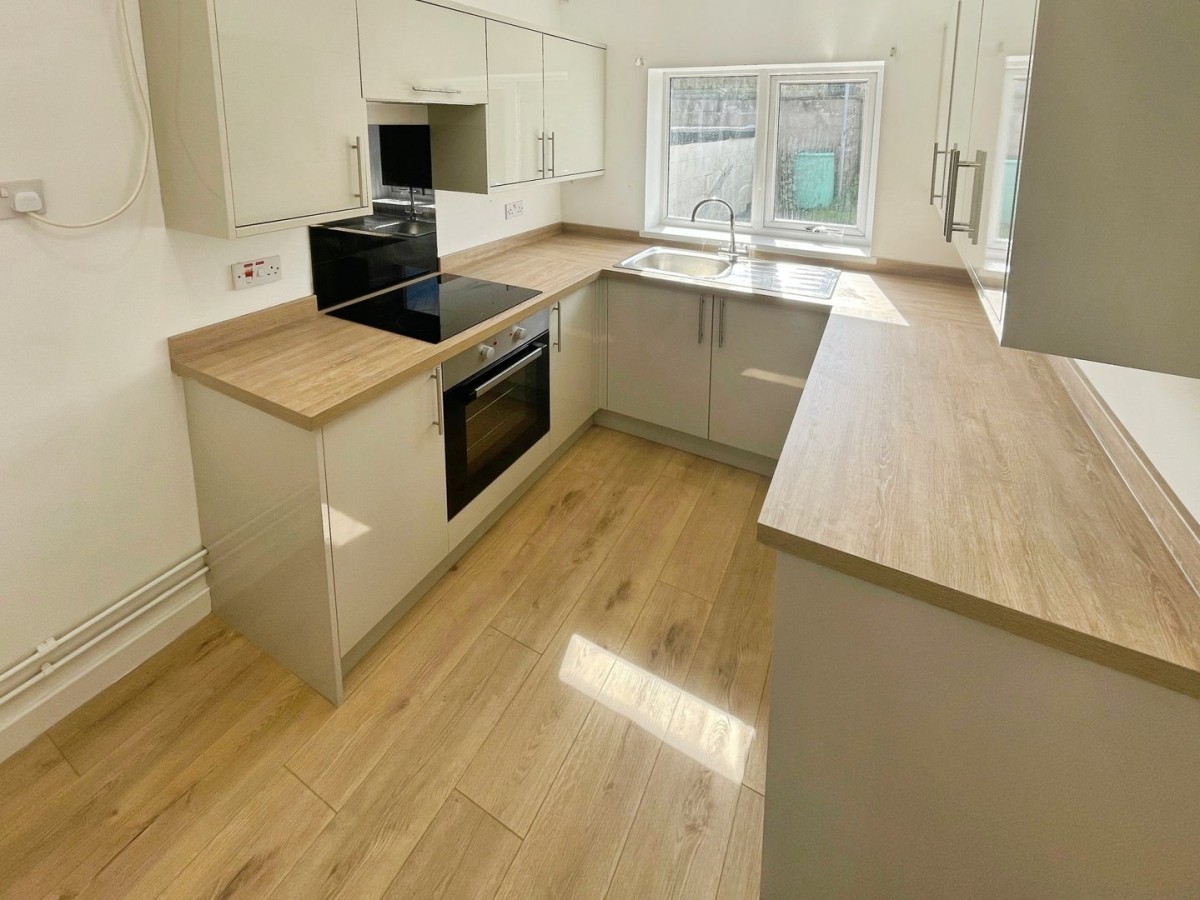 Emulsioned ceiling with spot lights, emulsioned walls, PVCu windows to the rear and side of the property, radiator and laminate flooring. Newly fitted kitchen comprising a range of wall and base units in a gloss finish. Ceramic hob with overhead extractor fan and glass splash back, built in oven and stainless steel sink/diner with mixer tap. Space for washing machine and fridge/freezer.