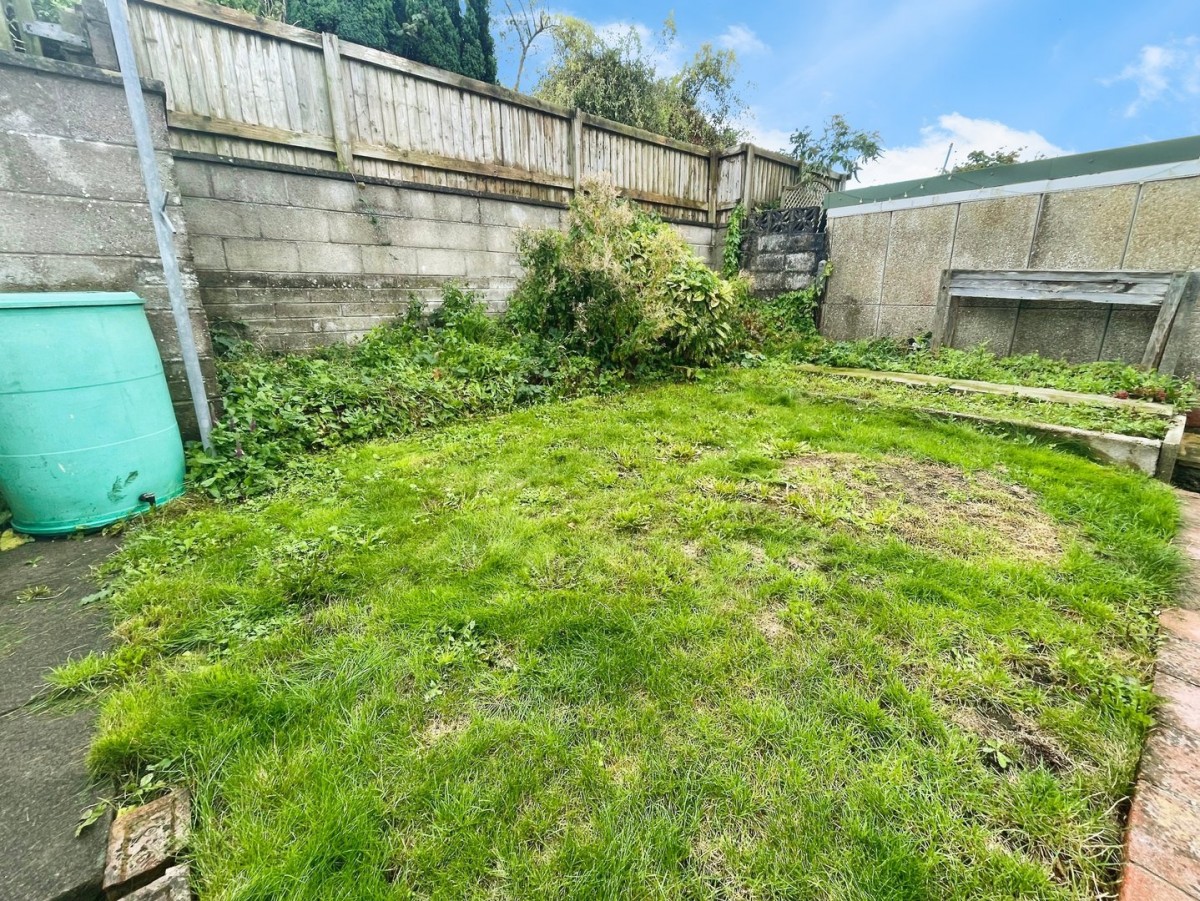 Wrought iron railings and handrail with ramp or step access to the front door. Decorative stone and slabbed areas with dwarf wall. Concrete driveway to the side leading to the detached garage. The rear garden is enclosed by wall with patio area and steps leading up to an area laid to lawn. Gate leading to the garage. Outside tap.