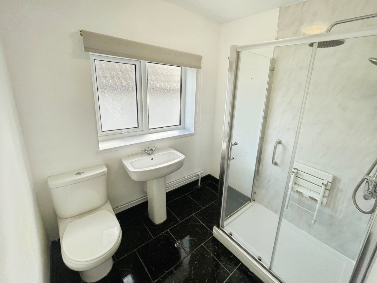 Emulsioned ceiling and walls, PVCu frosted glazed window to the side of the property and tiled flooring. Three piece suite comprising shower cubicle with aqua panels to the splash back, stainless steel shower with hand attachment and wall mounted seat with hand rail, low level w.c. and pedestal wash hand basin with stainless steel mixer tap and radiator.