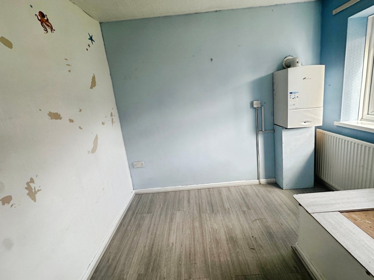 2.7m x 2.4m (8' 10" x 7' 10") L-shaped room overlooking the rear via PVCu double glazed window finished with emulsioned walls, laminate floor, wall mounted Worcester gas fired combination boiler and a cupboard above the stairs.