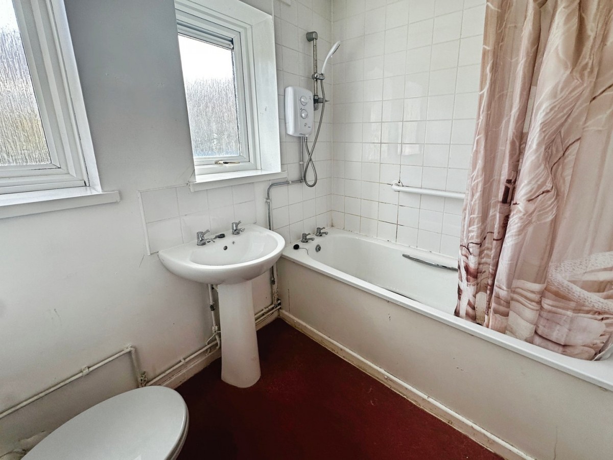 Two frosted glazed windows to the rear. Three-piece suite comprising WC, wash hand basin and bath with over bath electric shower and a vinyl floor.