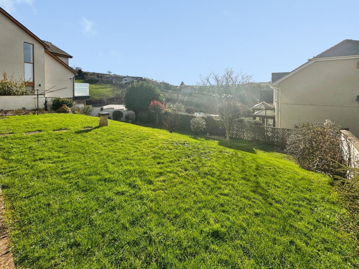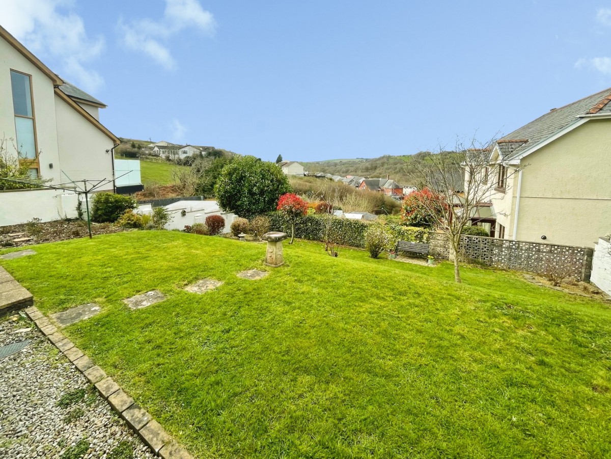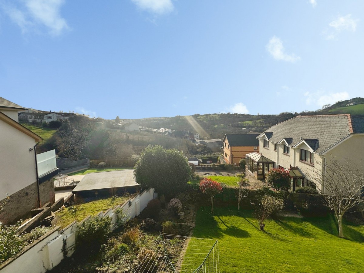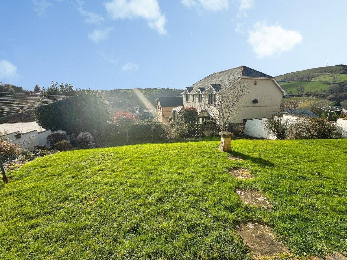 Enclosed rear garden laid to patio and lawn with mature trees and shrubs and fantastic valley views.