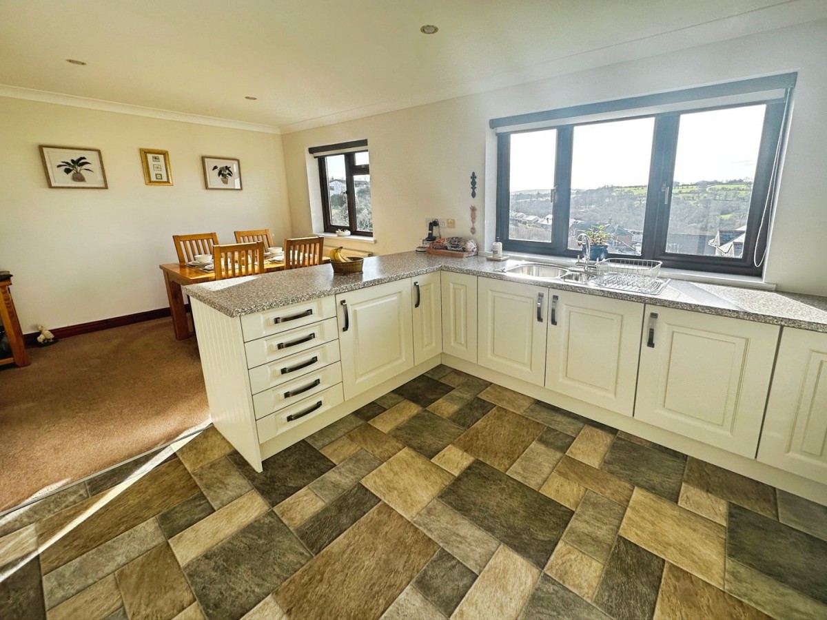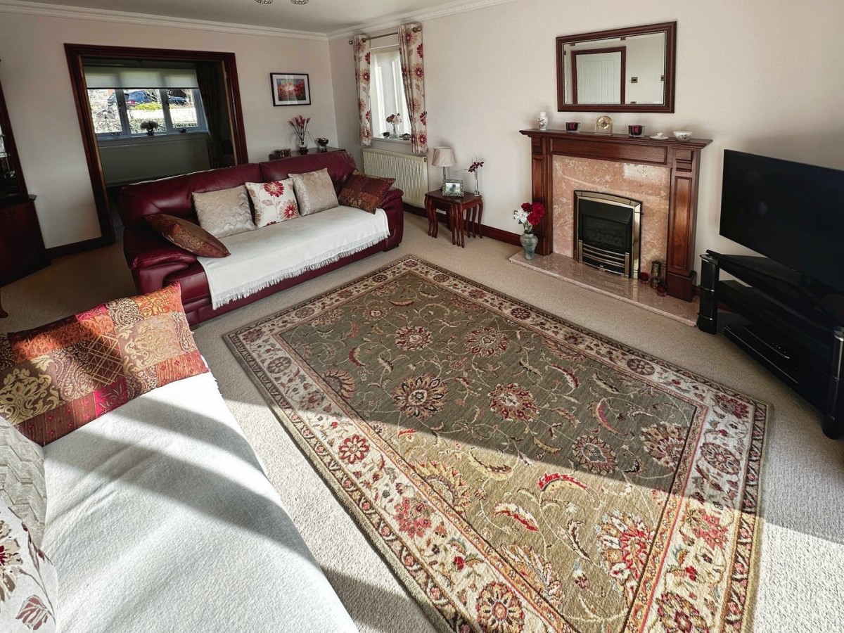 5.50m x 3.90m (18' 1" x 12' 10") Benefiting from superb valley views via PVCu sliding patio door leading out on to the enclosed balcony and finished with a coved ceiling, central ceiling rose, light fitting, emulsioned walls, PVCu double glazed window to the side with a fitted roller blind, feature coal effect gas living flame fire with a marble hearth and wooden mantel, skirting and fitted carpet.