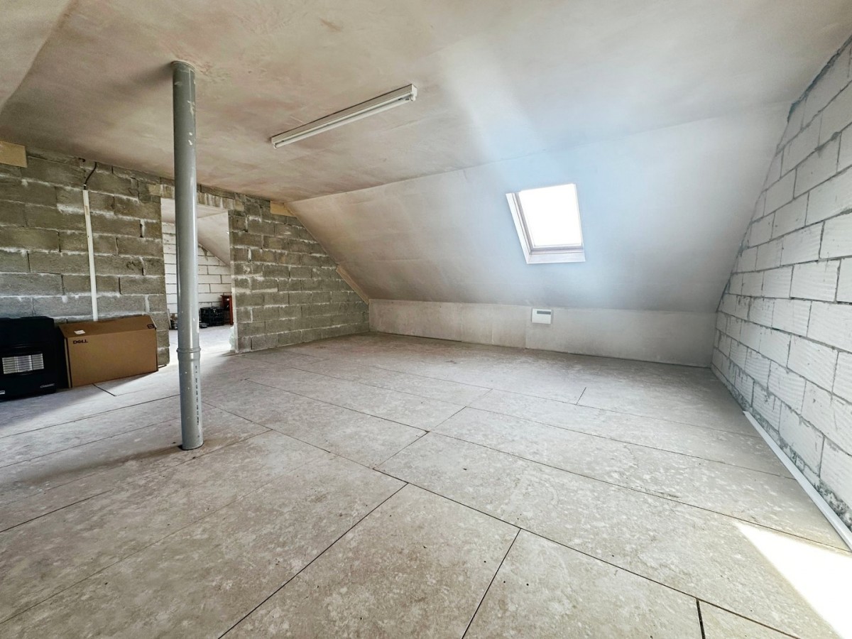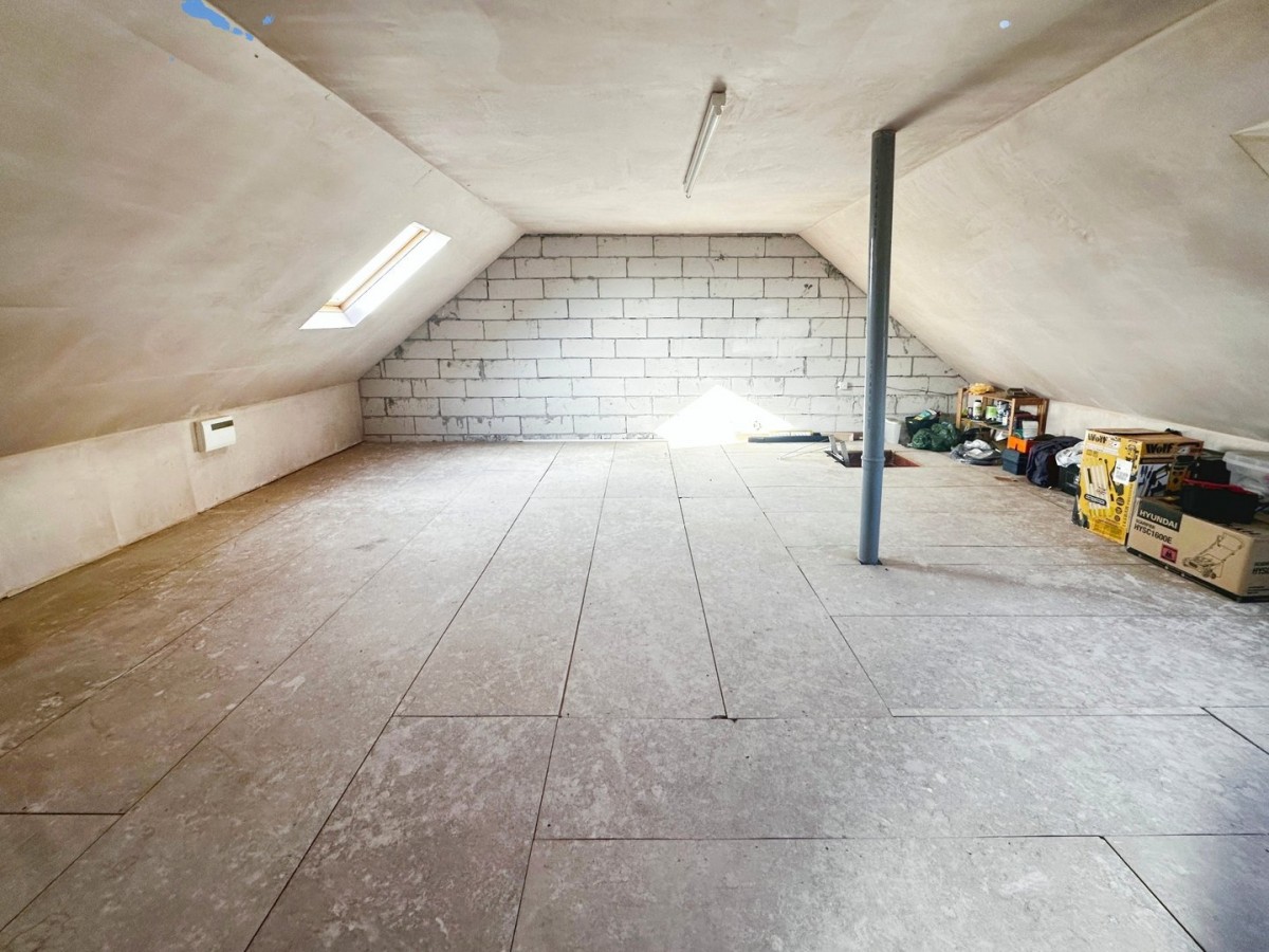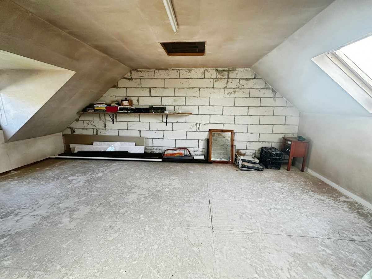 5.30m x 5.90m (17' 5" x 19' 4") Double glazed Velux skylight, central fluorescent strip light, double glazed window to the front with a fitted roller blind. Dividing block work wall to the second room.