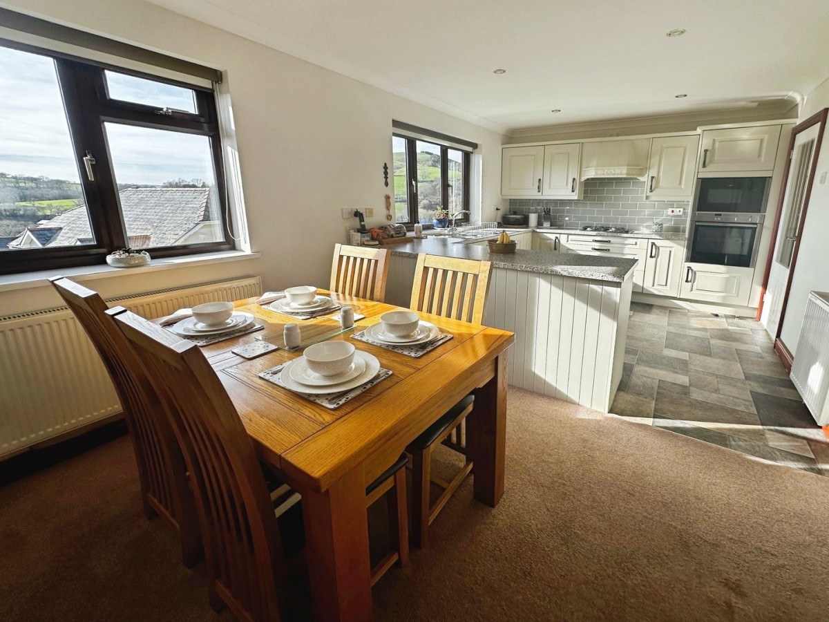 3.00m x 5.85m (9' 10" x 19' 2") Overlooking the rear via two PVCu double glazed windows both with fitted roller blinds and finished with a coved ceiling, recessed spot lights, emulsioned walls, skirting and fitted carpet to the dining area and vinyl flooring to the kitchen. A range of low level and wall mounted units in cream with brushed chrome handles and a complementary roll top work surface. Inset one and a half stainless steel sink with swan neck tap and drainer. Integrated four ring gas hob with overhead extractor hood. Integrated waist height electric oven and microwave. Under counter fridge. Door through to utility.