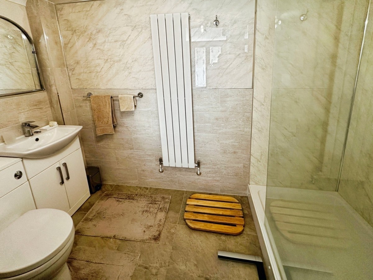Central light fitting, ceramic tiles and respatex to the walls, wall mounted vertical modern radiator, wall mounted shelf, wall mounted mirror, extractor and ceramic tiled flooring. Three piece suite comprising WC, wash hand basin with chrome mixer tap, vanity shelf and unit, large walk in shower with a side glazed shower screen housing a plumbed shower.