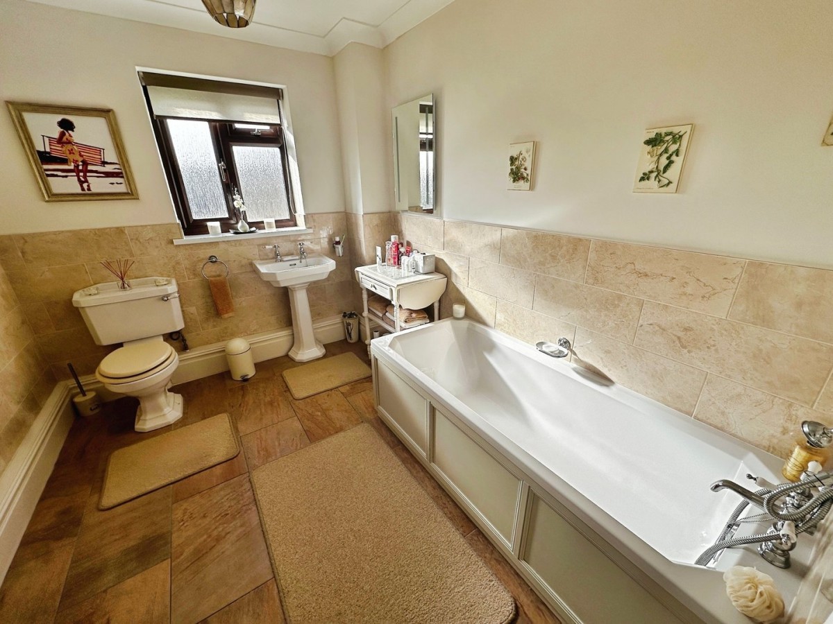PVCu frosted glazed window to the rear with a fitted roller blind, coved ceiling, central ceiling rose, part emulsioned/part ceramic tiled walls, radiator and a ceramic tiled floor. Three piece suite in white comprising WC, wash hand basin and bath with chrome mixer tap and shower attachment.