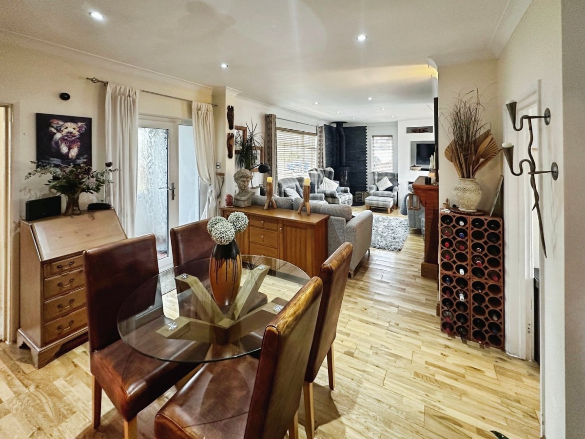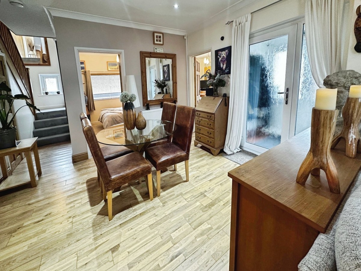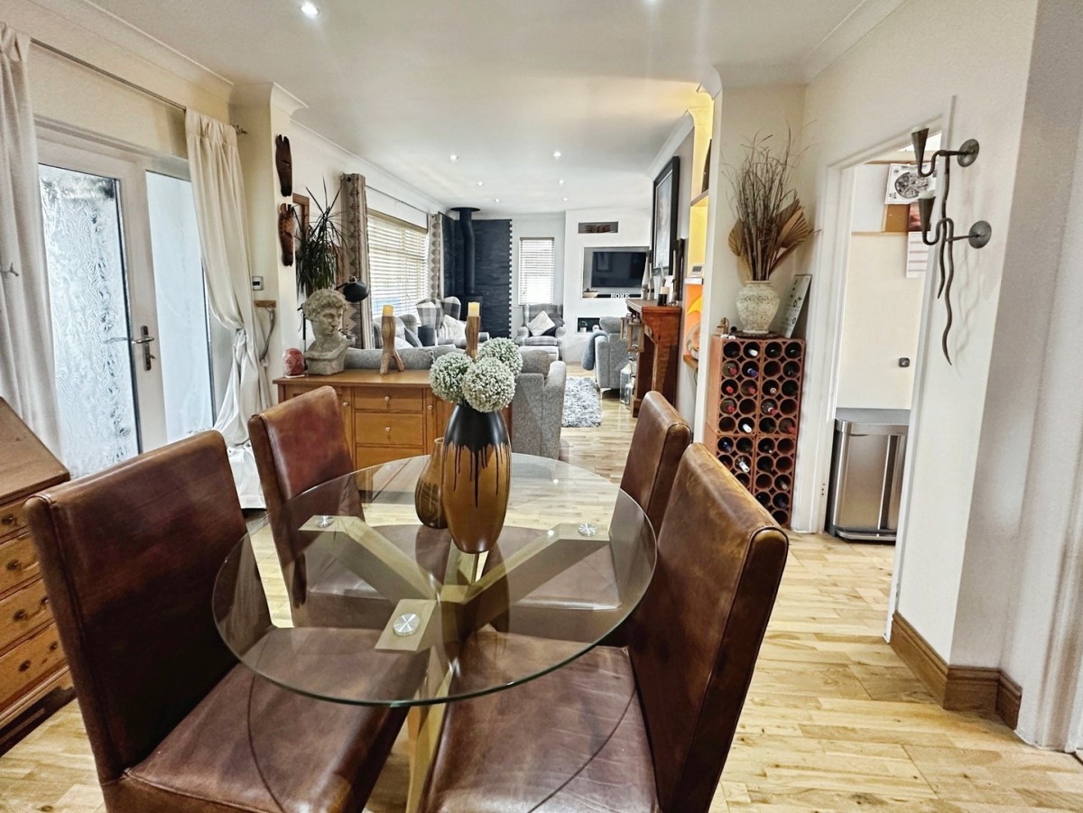 3.00m x 6.80m (9' 10" x 22' 4") To the dining area there is a PVCu double glazed window to the side with a fitted Venetian blind and PVCu double glazed French doors leading out to the rear patio. Space for dining table and chairs and a continuation of the solid oak floor.