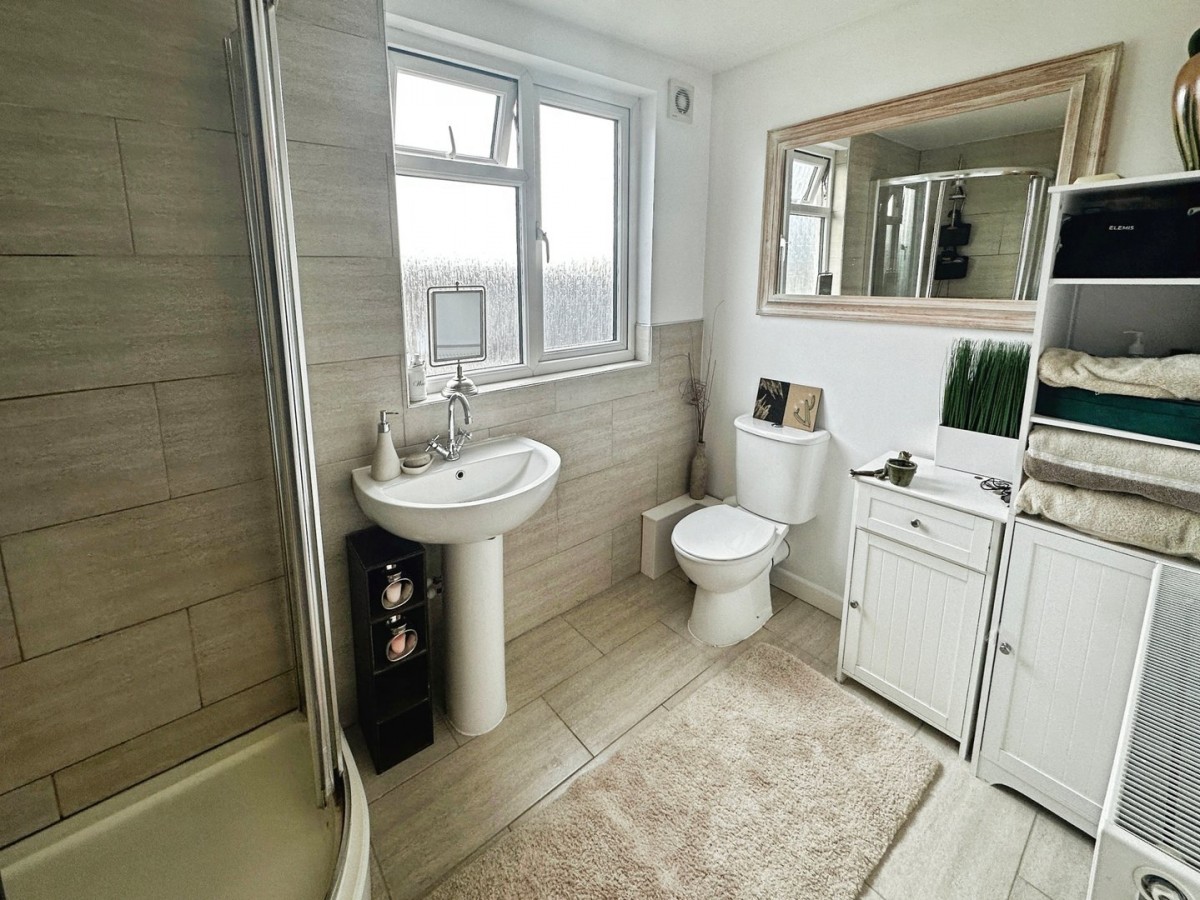 PVCu frosted glazed window to the rear, central light fitting, ceramic tiled flooring. Three piece suite comprising WC, wash hand basin with chrome mixer tap and a quadrant style shower cubicle with glazed doors housing a plumbed shower.