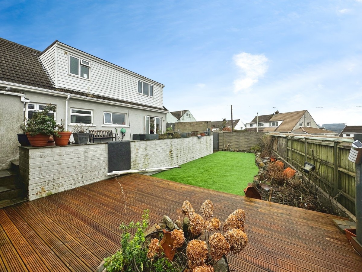 Enclosed rear garden laid to patio with steps leading down to an area of decking and artificial grass with raised beds and gated access to the side. Outside storage shed.