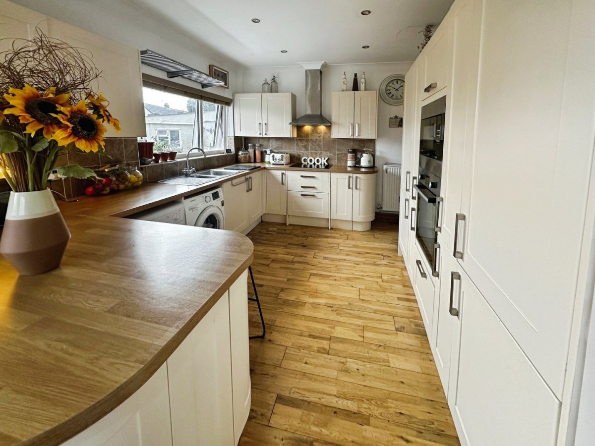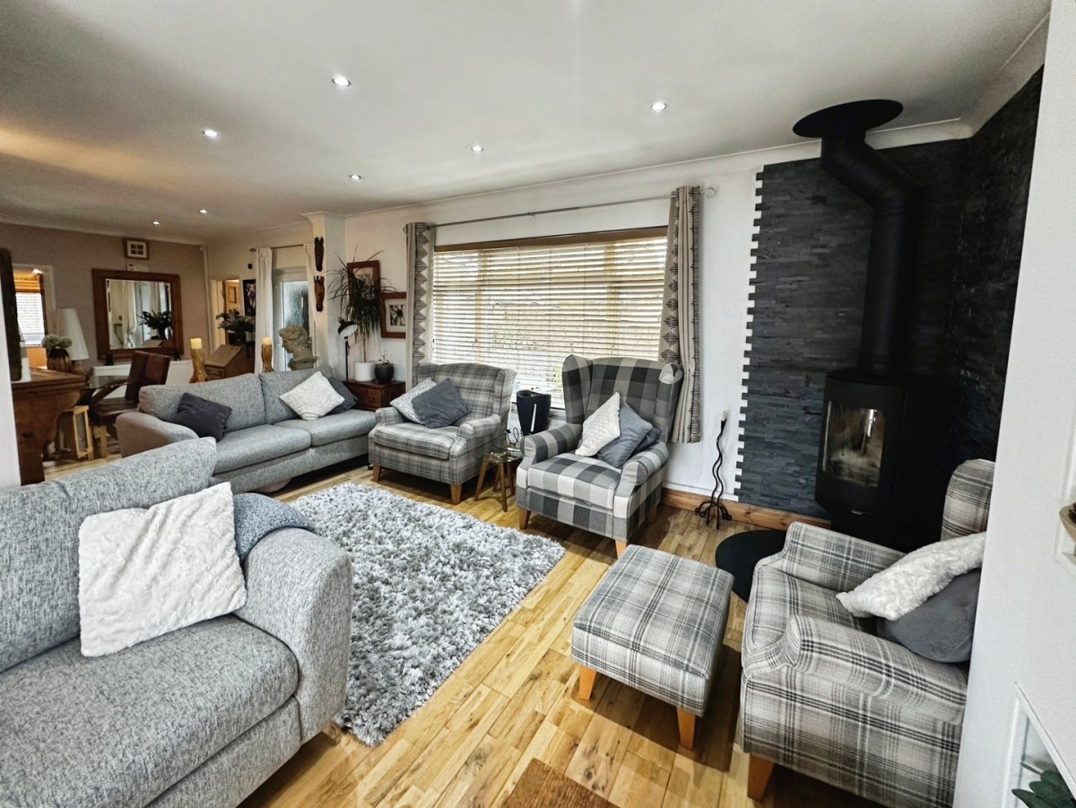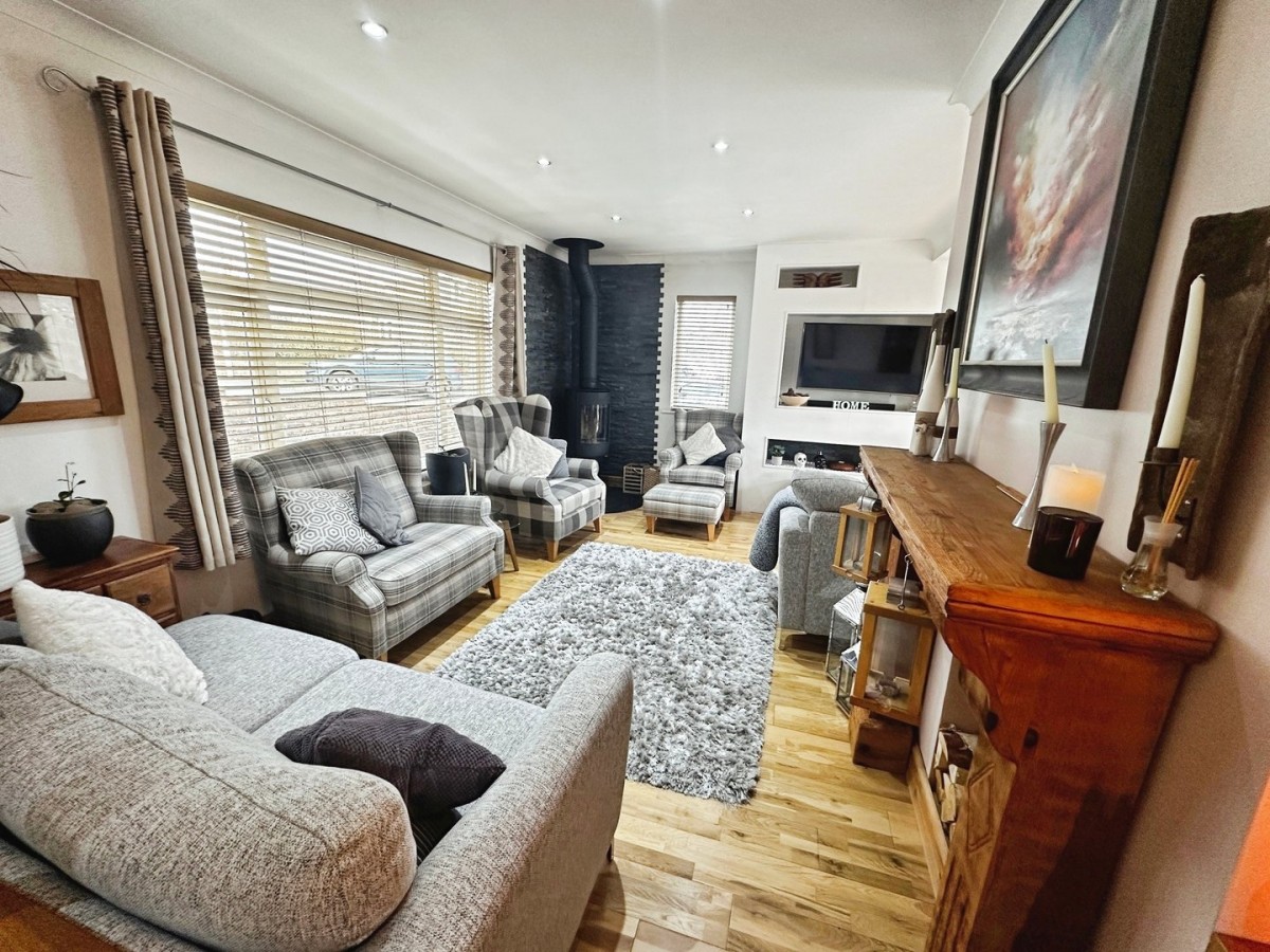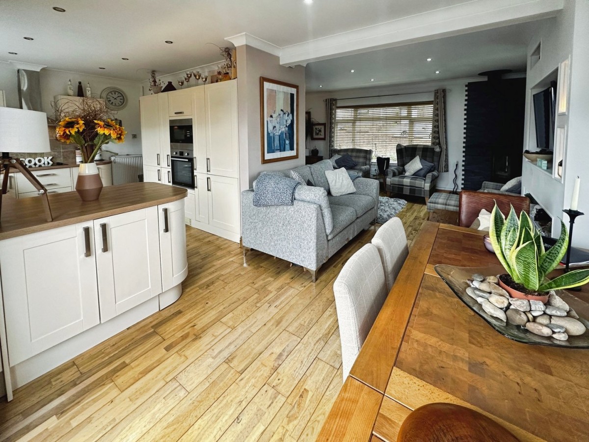 3.70m x 8.30m (12' 2" x 27' 3") Finished with recessed LED spot lights, coving, PVCu double glazed window overlooking the front and the side both with fitted Venetian blinds, emulsioned walls and a solid oak floor. Feature wood burning stove to the corner with granite heath and slate tiles to the recess. Media wall with space for flat screen TV. Open arch through into the kitchen/diner.