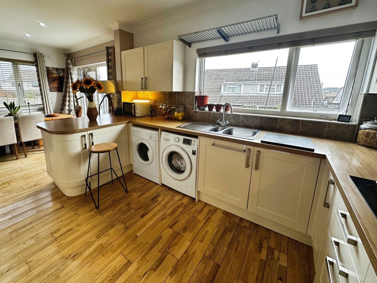 The kitchen is arranged with low level and wall mounted units in a shaker style cream with chrome handles and a complementary roll top work surface. Inset one and a half basin sink with swan neck tap and drainer. Integrated electric hob with overhead extractor hood. Fridge/freezer, electric oven and microwave. Plumbing for automatic washing machine and space for tumble dryer.