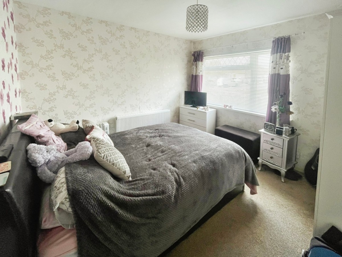 3.9m x 4.3m (12' 10" x 14' 1") Papered ceiling and walls, PVCu window overlooking the front with blinds, wardrobes, radiator and fitted carpet.