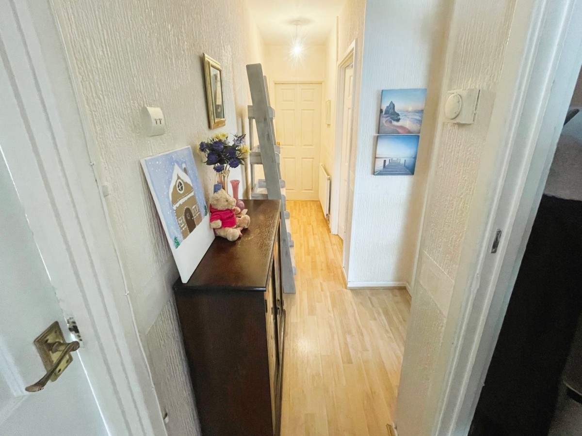 Emulsioned ceiling, papered walls, radiator and laminate flooring. Doors leading to kitchen, bathroom, two bedrooms and sliding door to storage space.