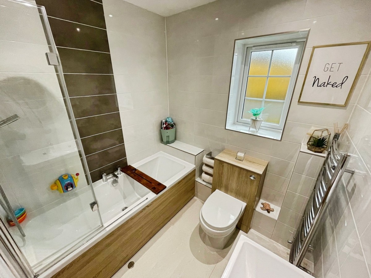 1.89m x 1.97m (6' 2" x 6' 6") Plastered and emulsioned ceiling with inset spot lights and extractor fan, floor to ceiling tiled walls and tiled flooring. Three piece suite comprising bath with chrome mixer tap and overhead chrome mixer shower with handheld shower attachment and folding glass screen, vanity unit with w.c. and ceramic sink and chrome mixer tap. PVCu frosted double glazed window overlooking the rear and wall mounted chrome towel radiator.
